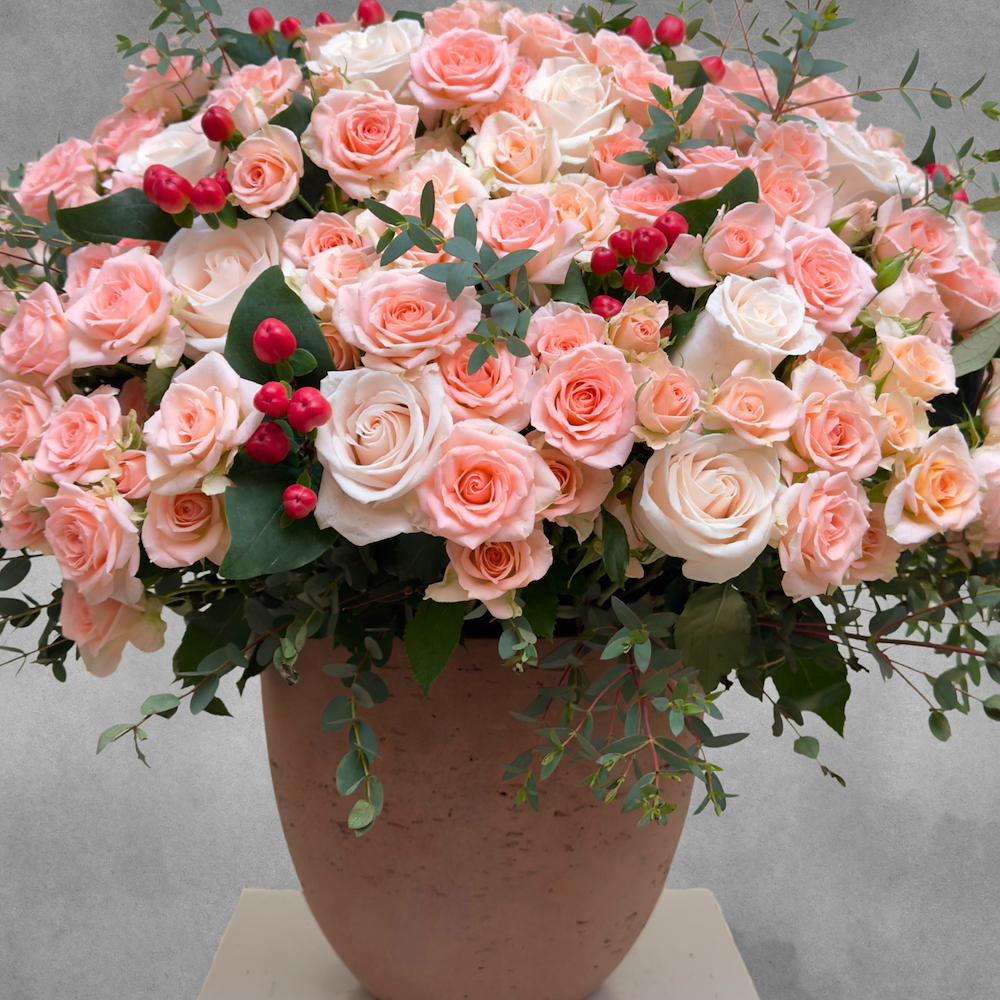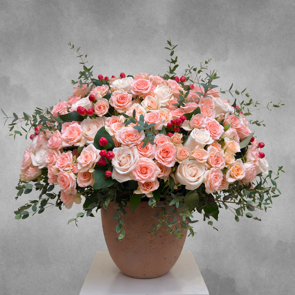فازة من الفخار مليئة بأزهار الجوري فينديلا، البيبي روز باللون الخوخي، الهابريكوم وأوراق الأوكالبتوس باللون الأخضر.