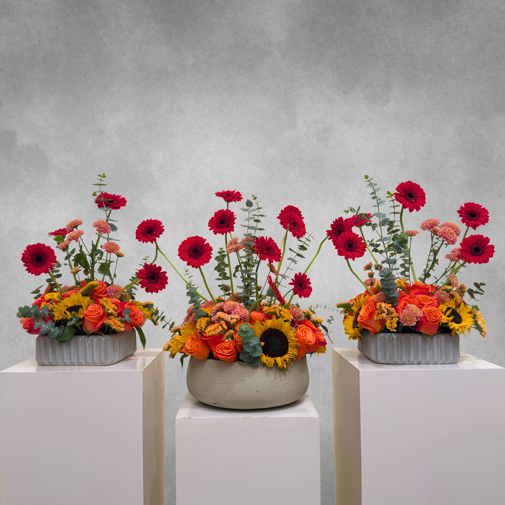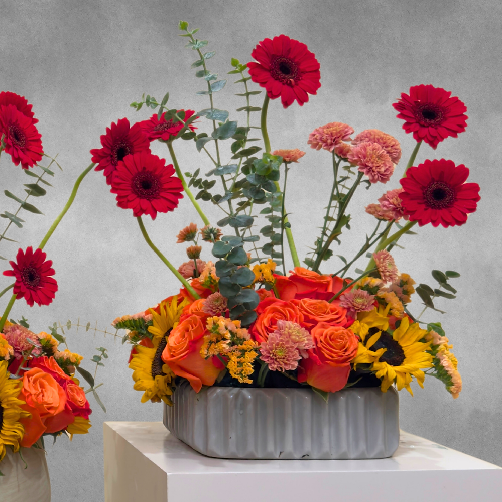 مجموعة من فازتين سيراميك بشكل مربع ووعاء سيراميك بلون البيج، مرتبة بشكل جميل بزهور الجوري، دوار الشمس، الجيربيرا، الكريز، السيليكس والسوليدل