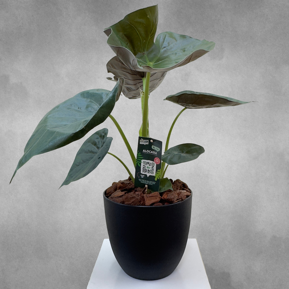 نبات أذن الفيل القوي الألوكاسيا وينتي في أصيص أسود.
