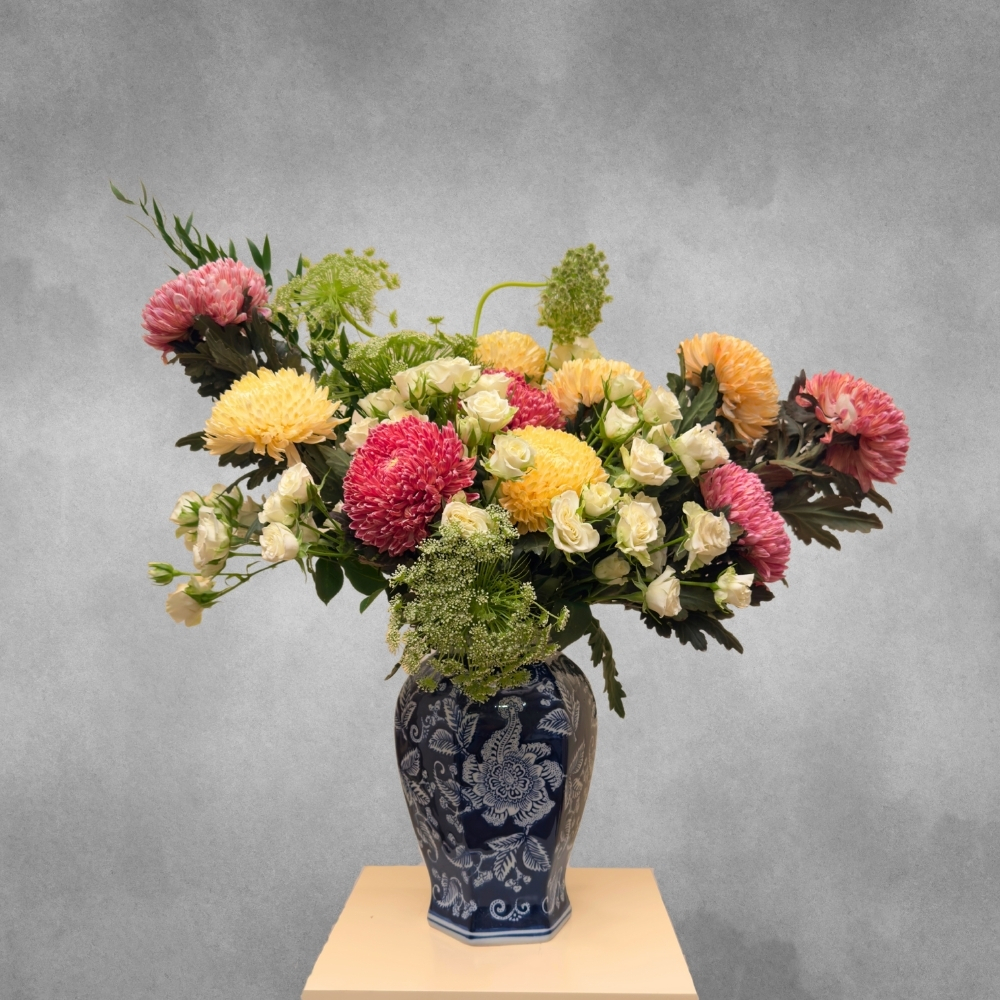 فازة فخارية زرقاء تحتوي على كريمن أصفر وجوري صغيرة وردية وبيضاء وأمني ماجوس وروسكوس إيطالي.