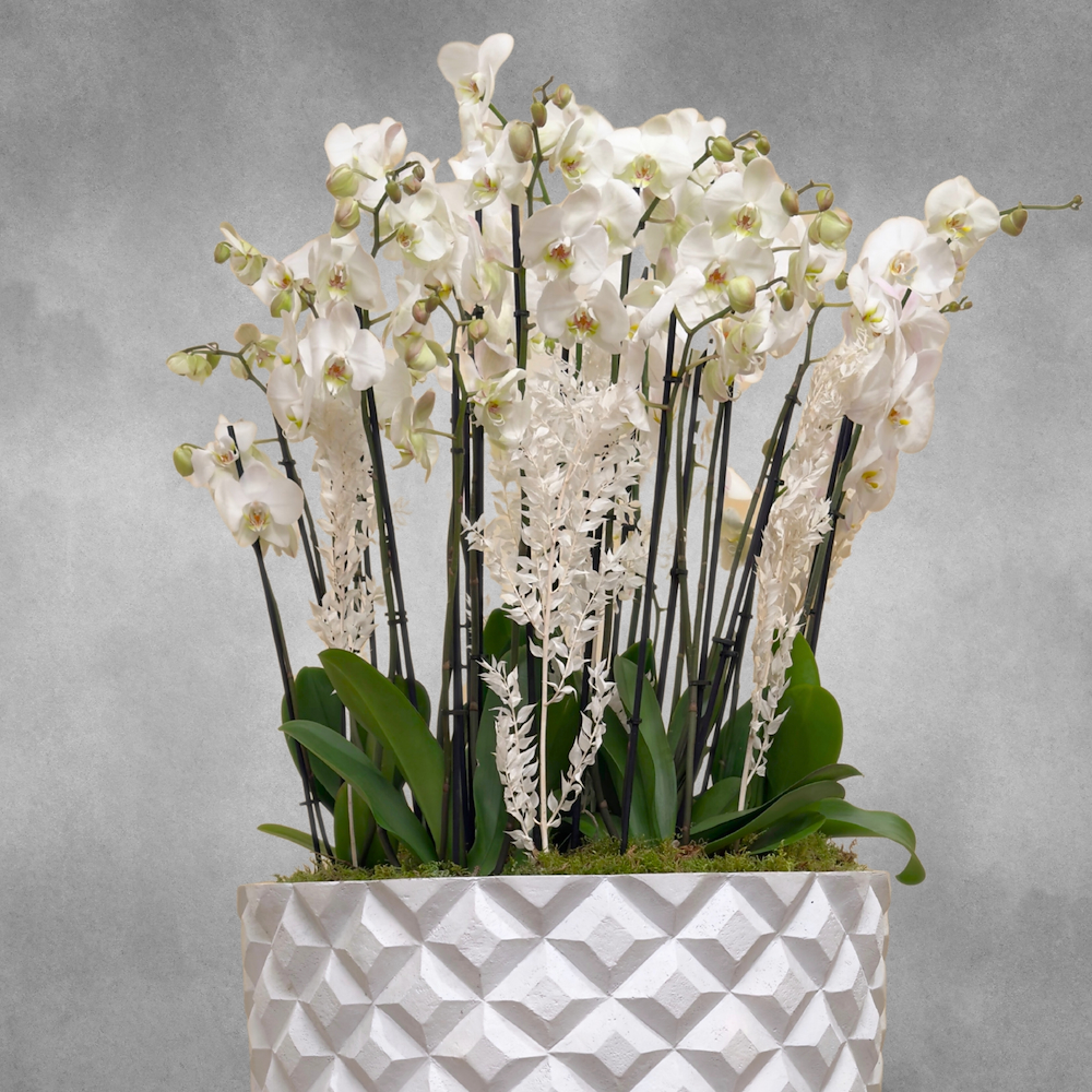 فازة هيرالدري من كابي مليئة بنباتات الأوركيد البيضاء وأوراق الروسكاس المحفوظة.