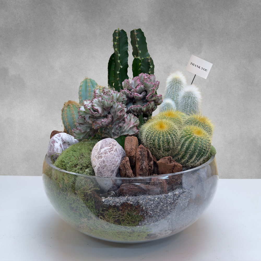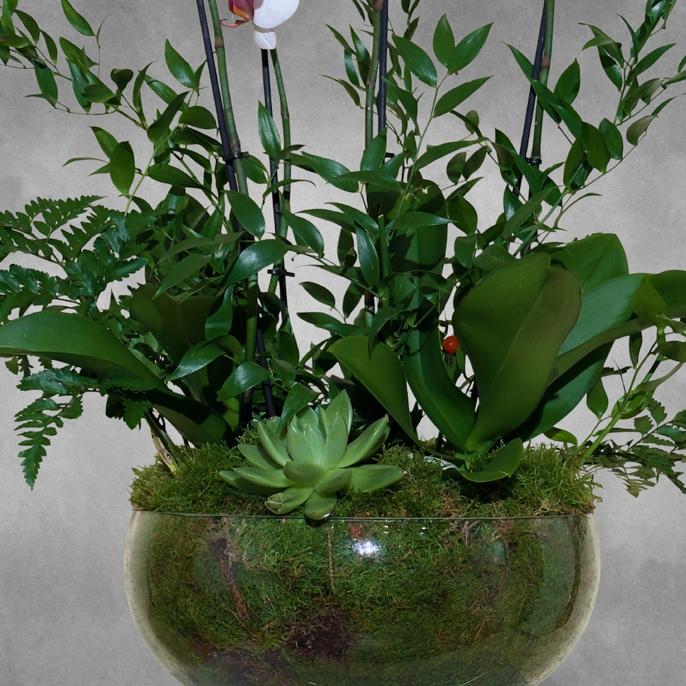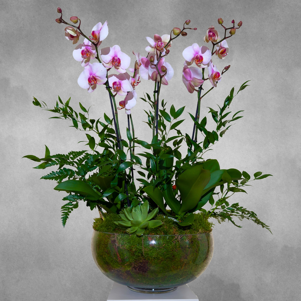 فازة زجاجية مليئة بنباتات الأوركيد باللون الوردي وأوراق الروسكاس.