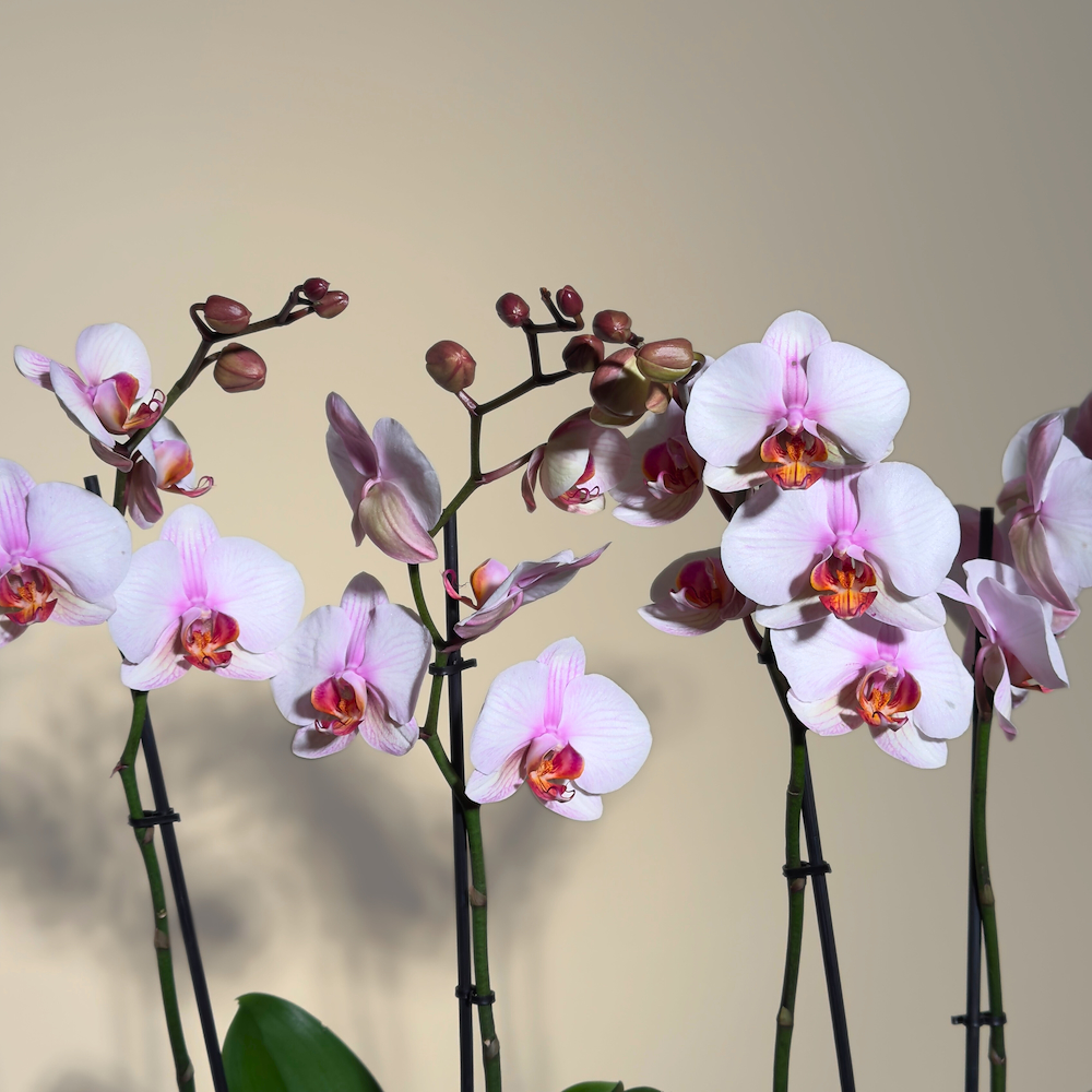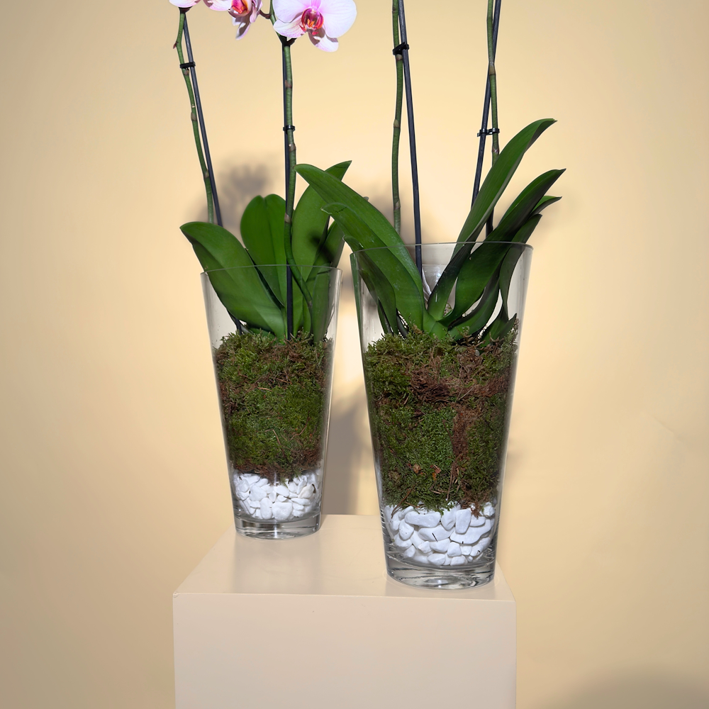 فازة زجاجية شفافة تحتوي على نبتات أوركيد وردية فاتحة.