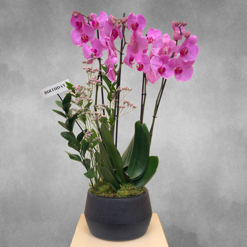 فازة من السيراميك مرتبة بنباتات الأوركيد باللون الوردي، أوراق الروسكوس وأزهار الواكس.