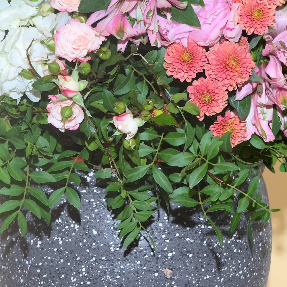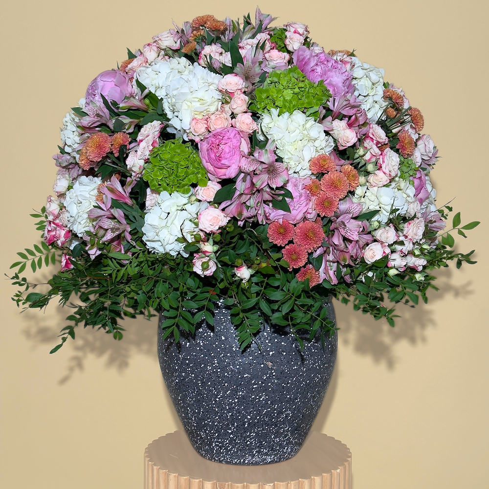 فازة خزفية مليئة بأزهار البيوني، السترومريا، الكوبية، الجوري والكريز.