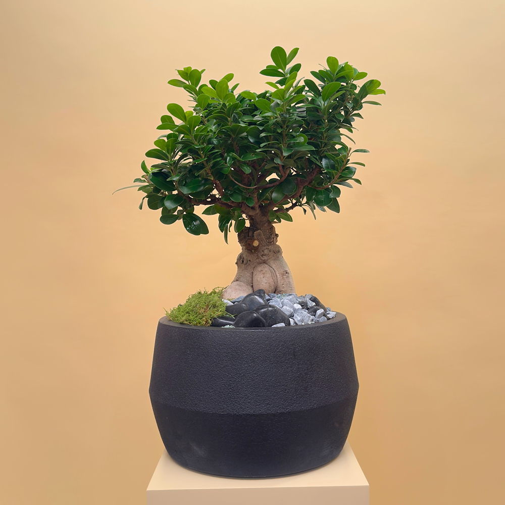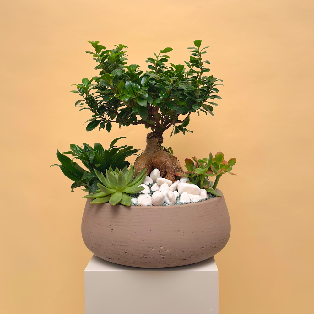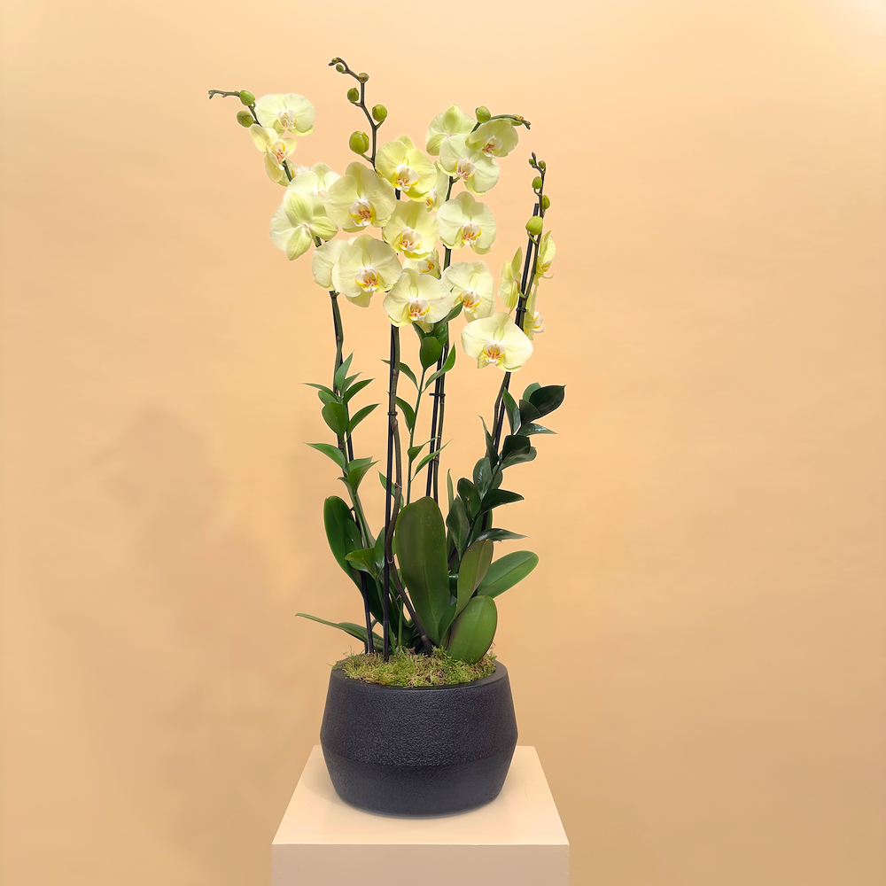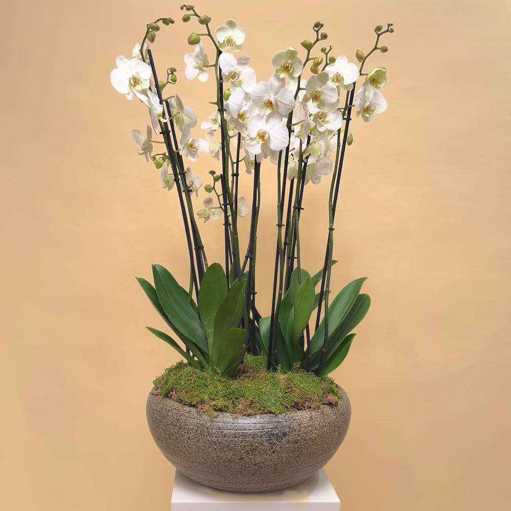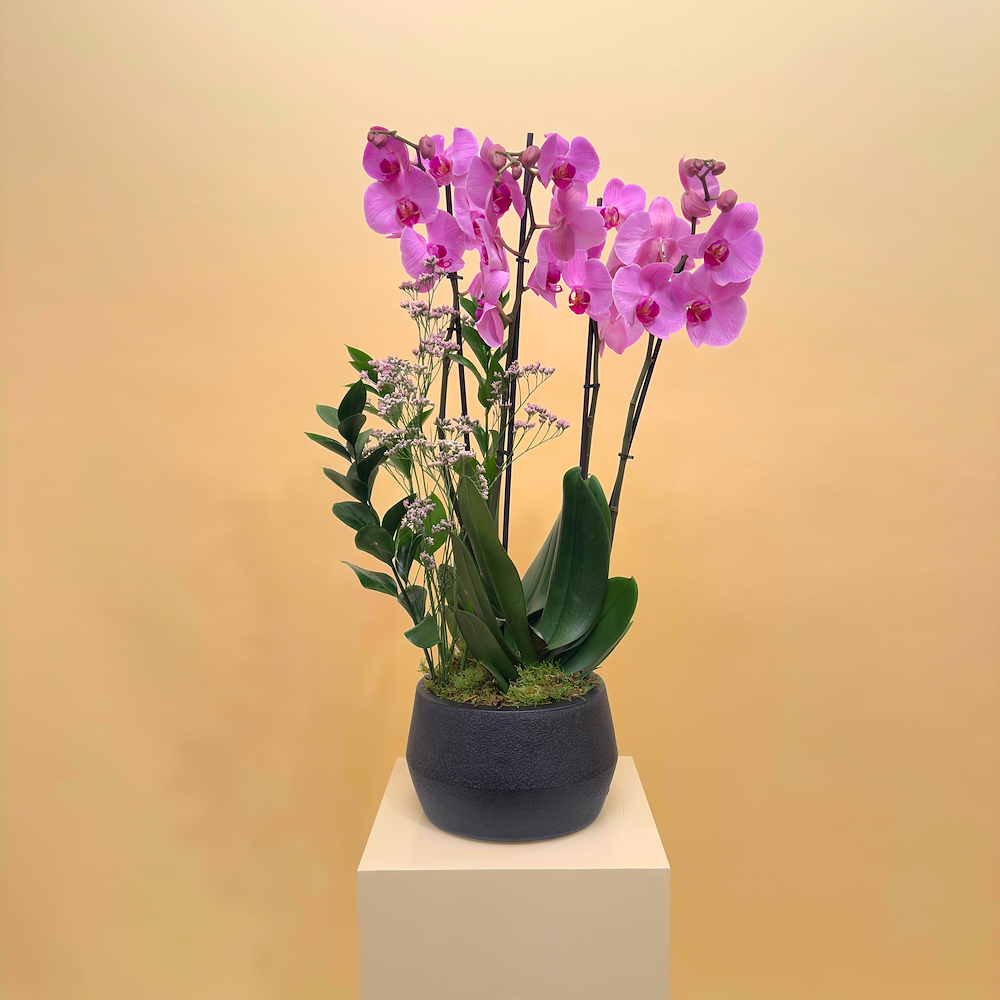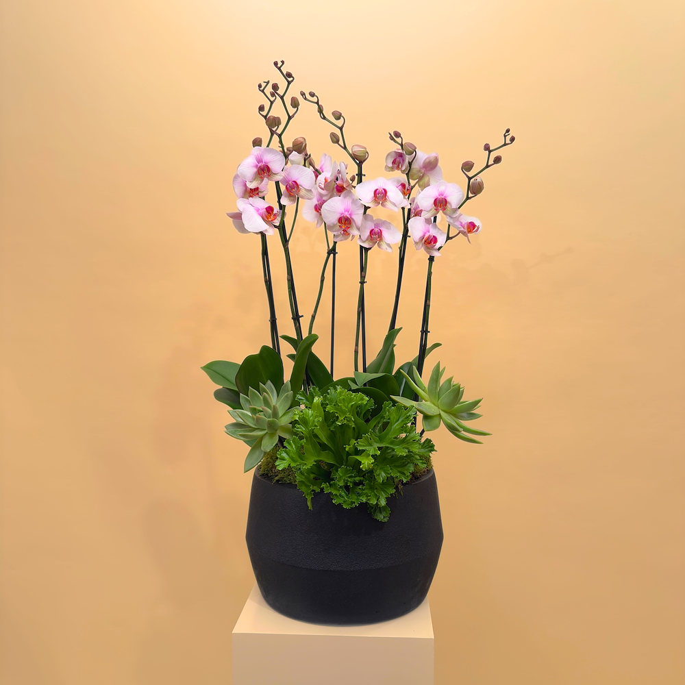 فازة خزفية مليئة بنباتات الأوركيد، الإشفيريا، ونبات سبلينيوم ليزلي.