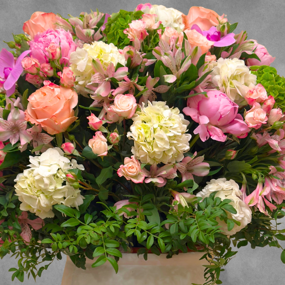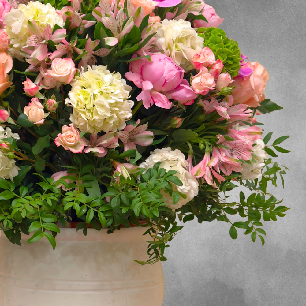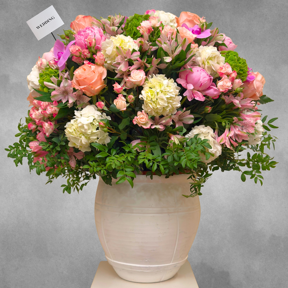 فازة فخارية بيضاء تحتوي على زهور الجوري، البيبي جوري، البيوني، الأوركيد، الهايدرينجا والألستروميريا.