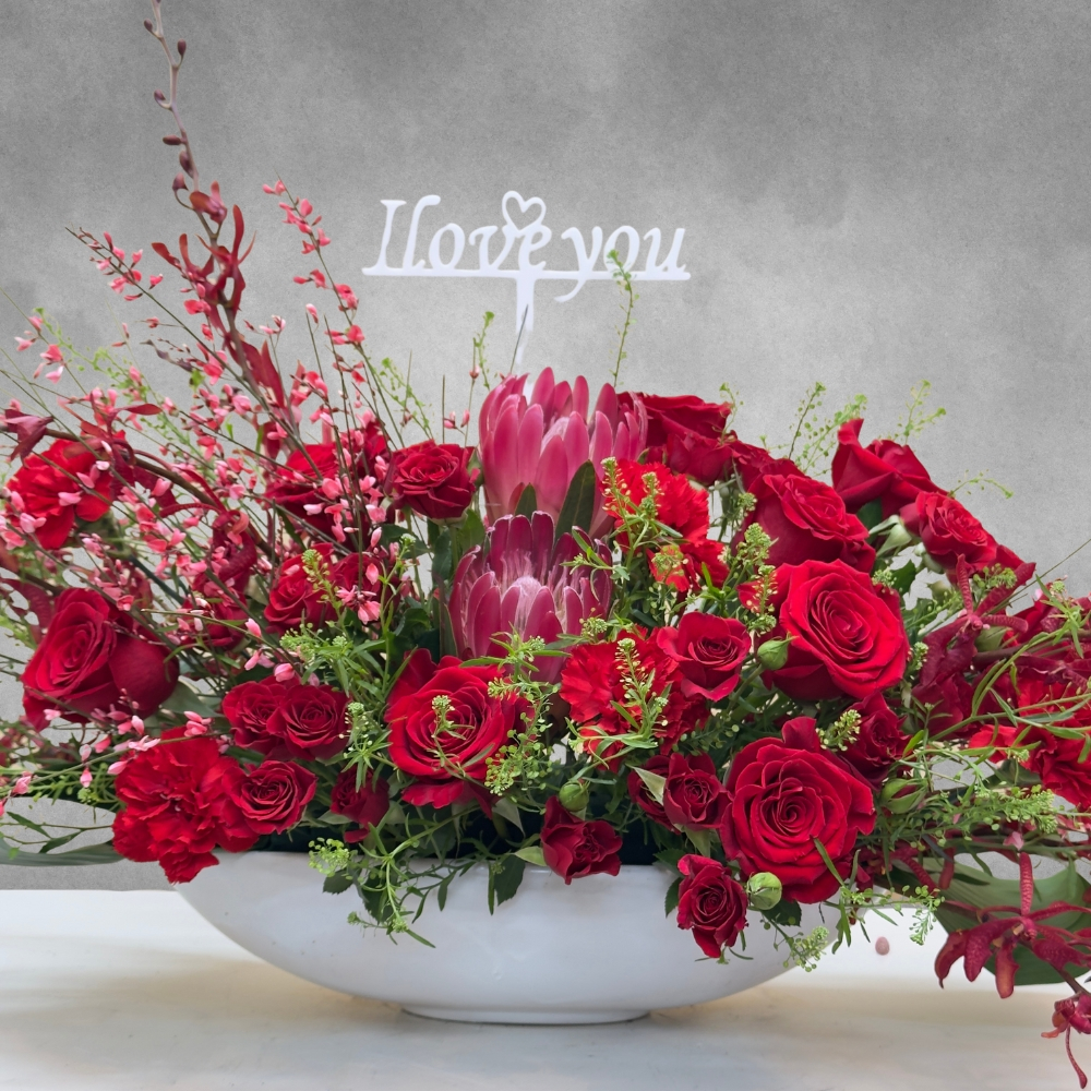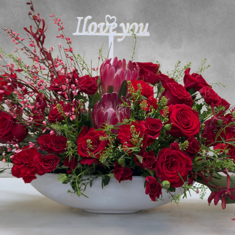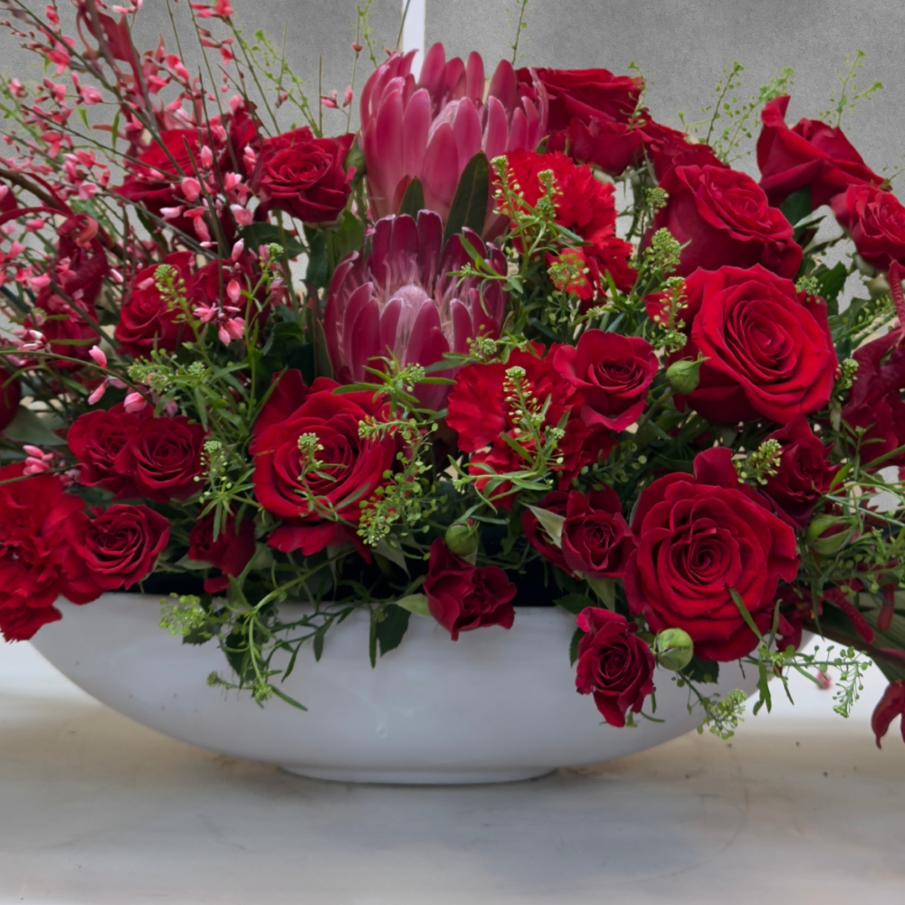 فازة بيضاوية أنيقة مليئة بأزهار الموكارا، بيبي روز، بروتيا وأوراق الليبيديوم.