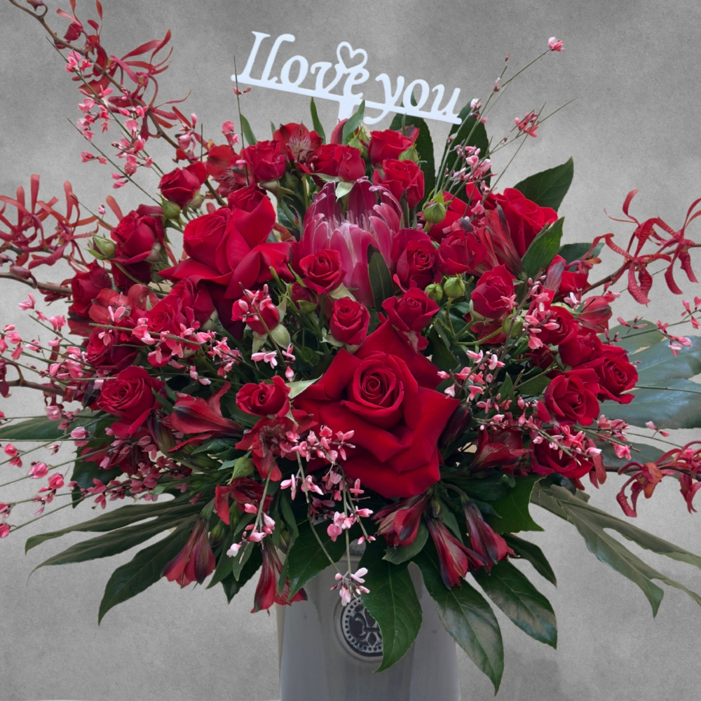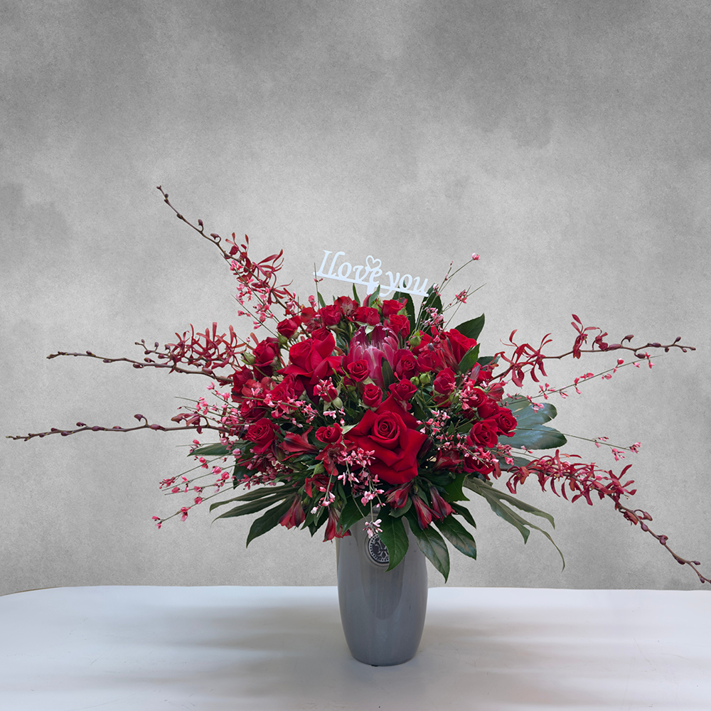 باقة من زهور الجوري والبروتيا الحمراء، والبيبي الأوركيد الوردية من نوع موكارا، منسقة بشكلٍ جميل في فازة رمادية. عرض عصري وجذاب يضفي لمسة من الأناقة على أي مكان.