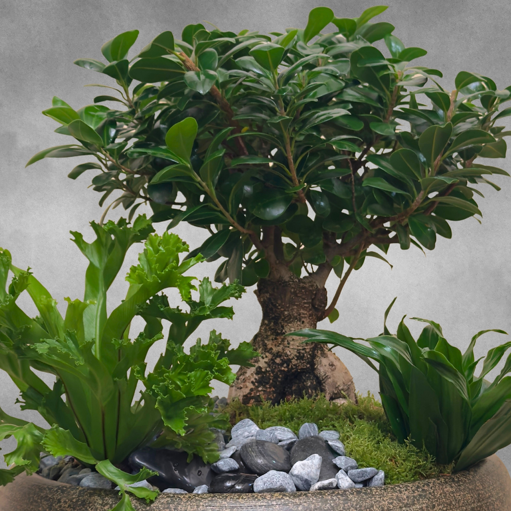 فازة فاخرة من السيراميك مرتبة بشجرة بونساي فيكس جينسينغ، نباتات سبلينيوم ليزلي والدراكاينا.