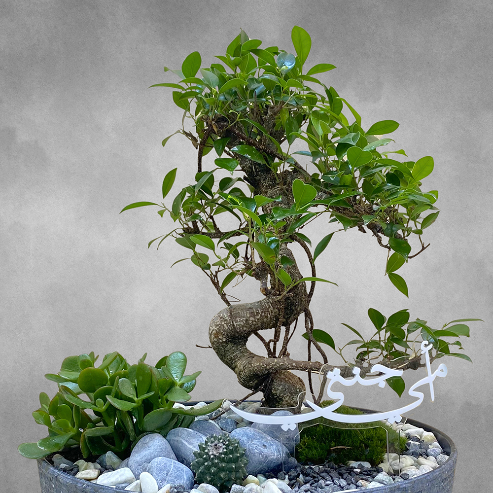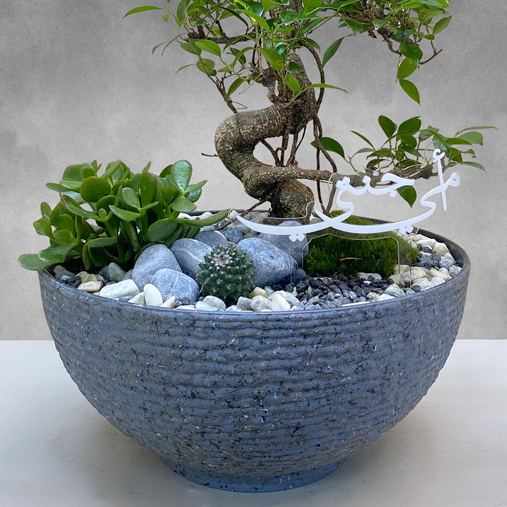 وعاء رمادي يحتوي على فيكس بونساي.