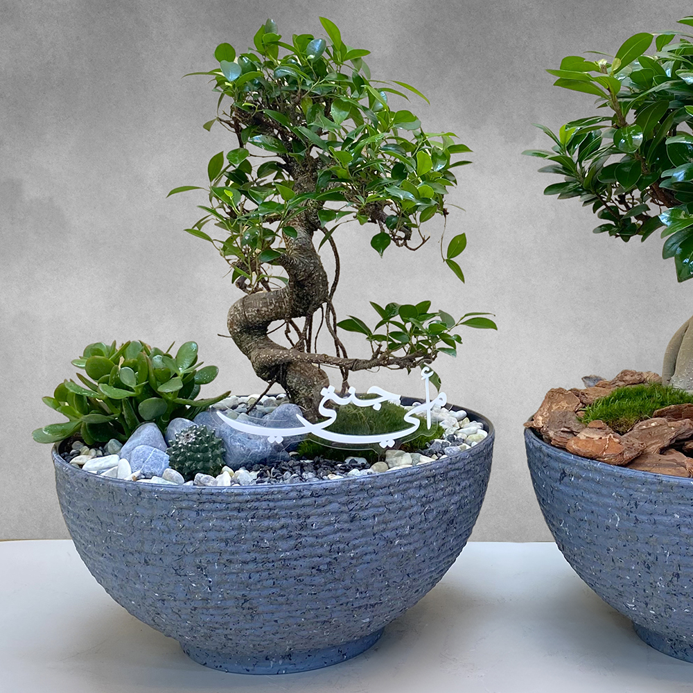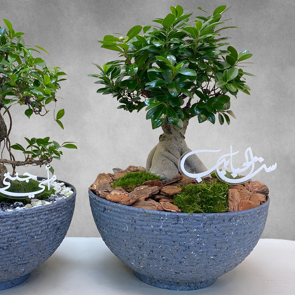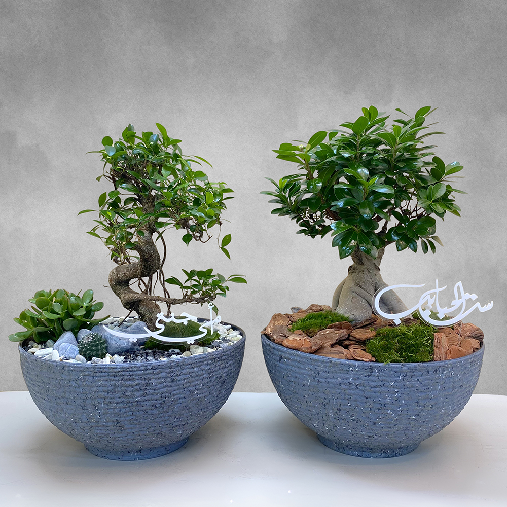مجموعة من وعائين رماديين يحتوي كل منهما على نباتات الفيكوس ريتوسا بونساي والفيكوس جينسينغ بونساي، مرتبة بشكل جميل.