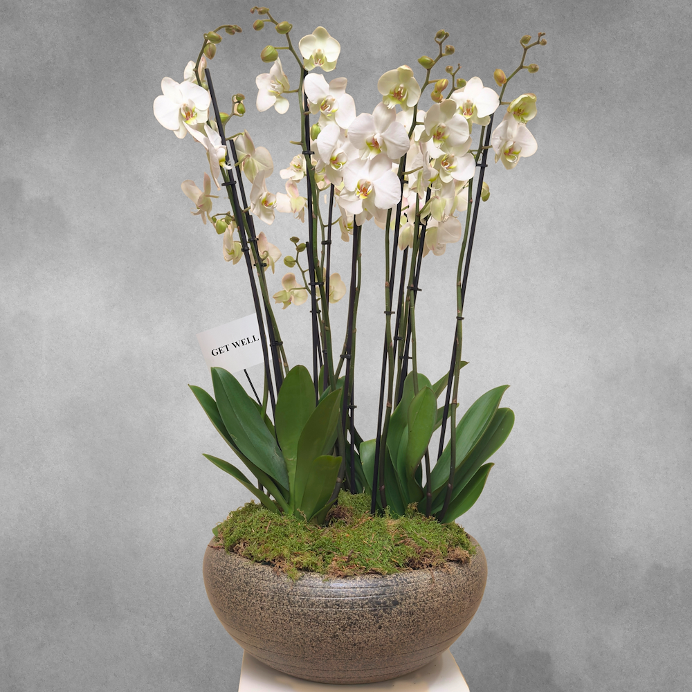 فازة من السيراميك مرتبة بنباتات الأوركيد البيضاء.