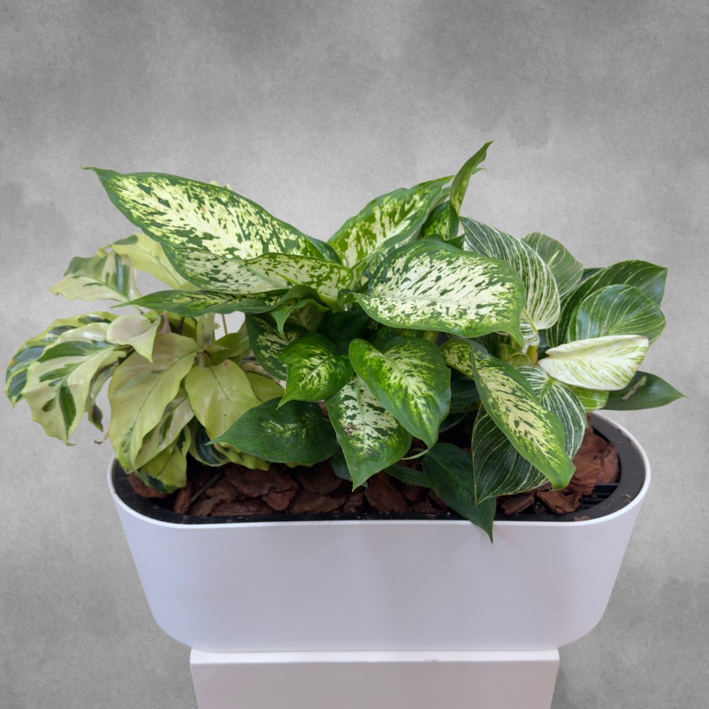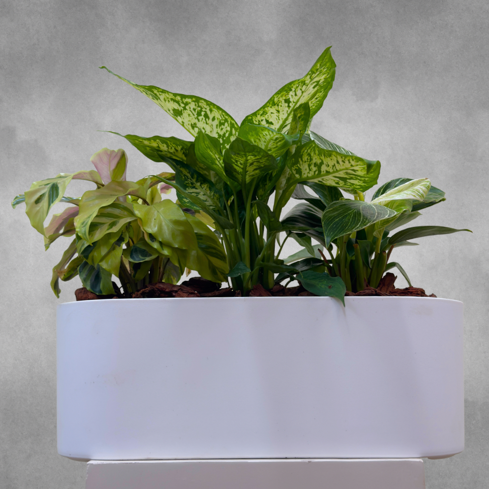 نباتات ديفنباخيا، وكالاتيا فيوجن، وفيلوديندرون مزروعة في أصيص بيضاوي أبيض.