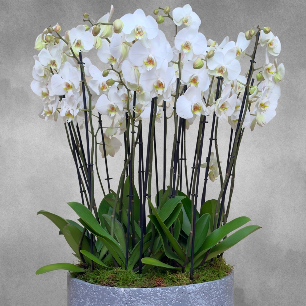 بلانتر خزفي مليئ بنباتات الأوركيد البيضاء.