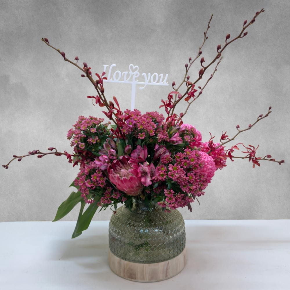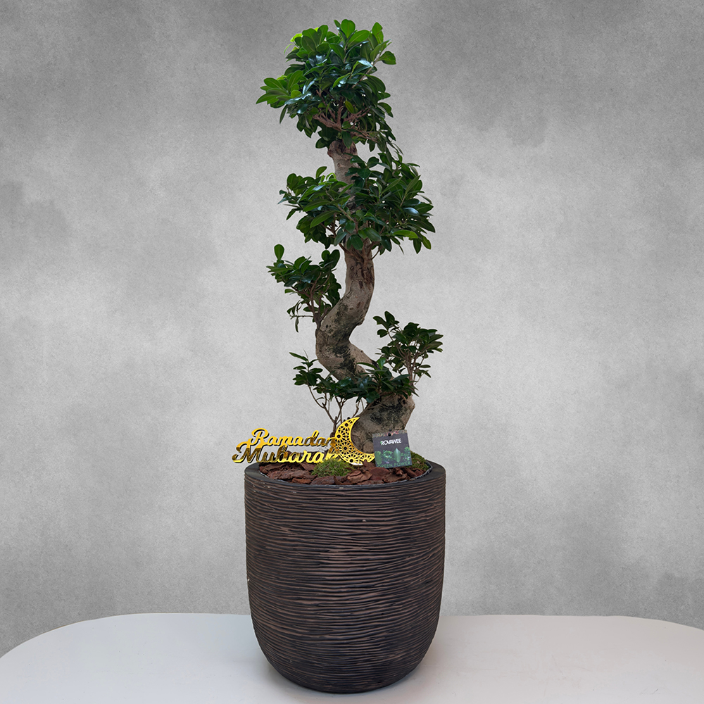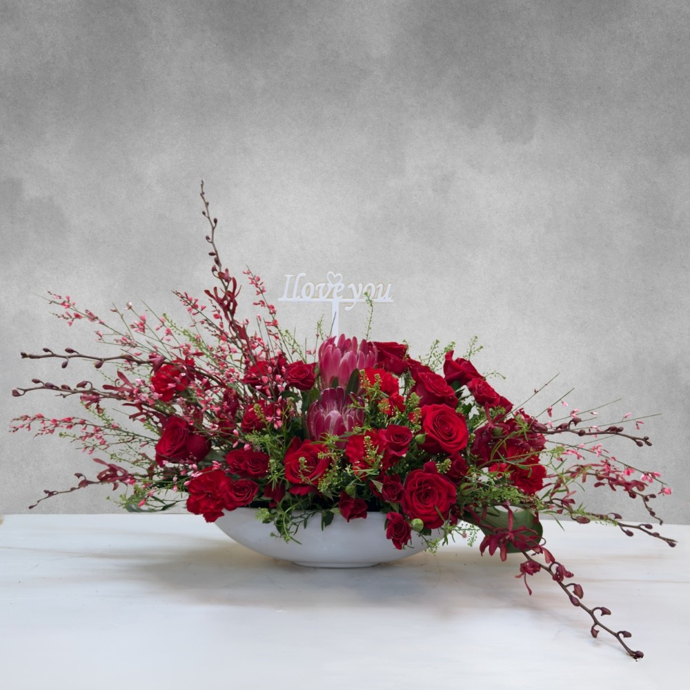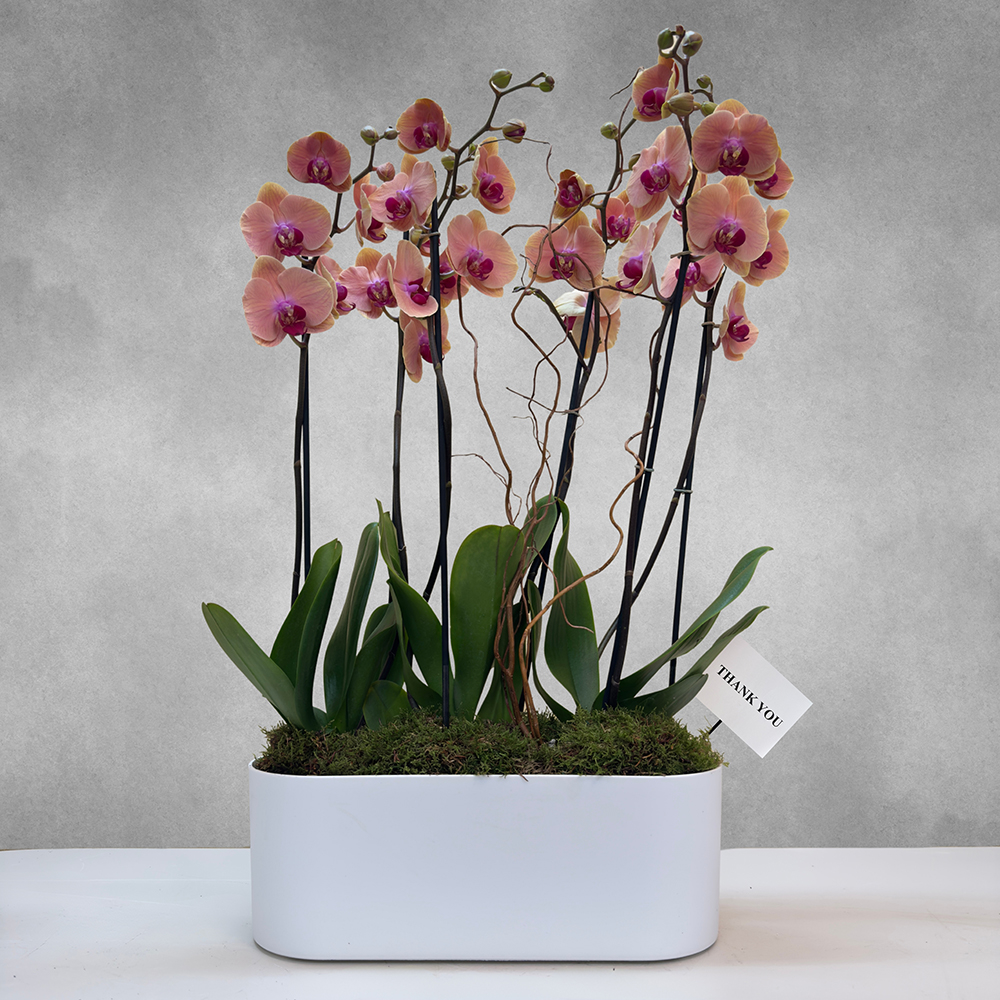 مجموعة من نباتات الأوركيد الصفراء، الديفنبانشيا والصبار، مرتبة في وعاء مربع من السيراميك.