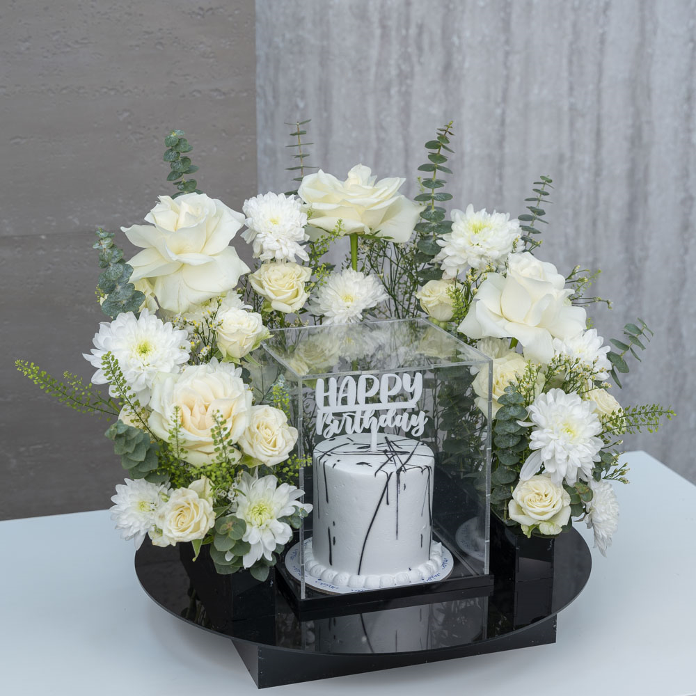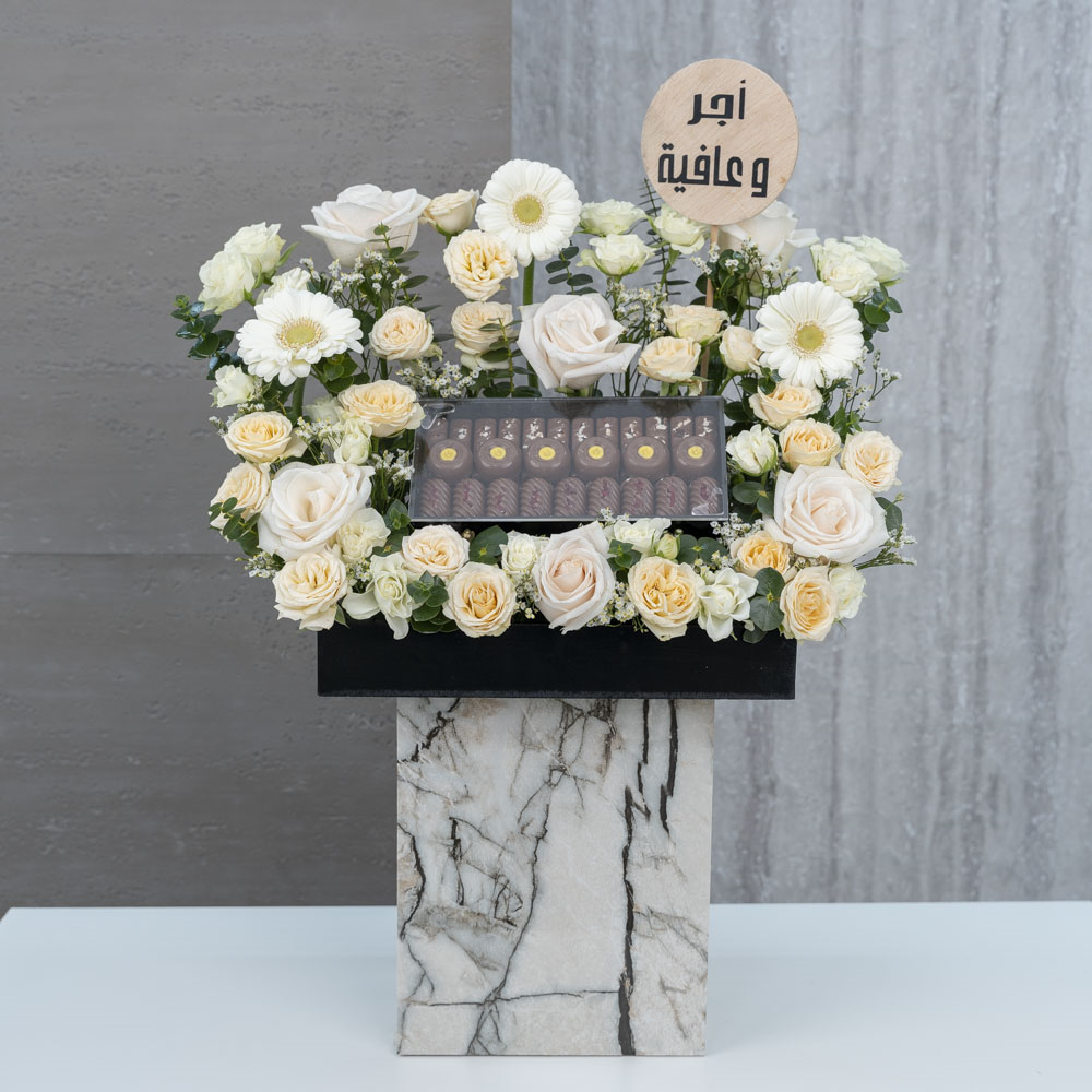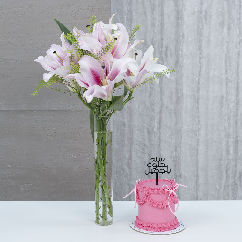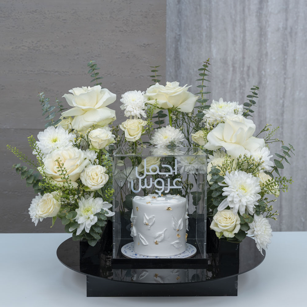 هذه الباقة تحتوي على زهور الكازابلانكا مع كيكة الشوكولاتة.