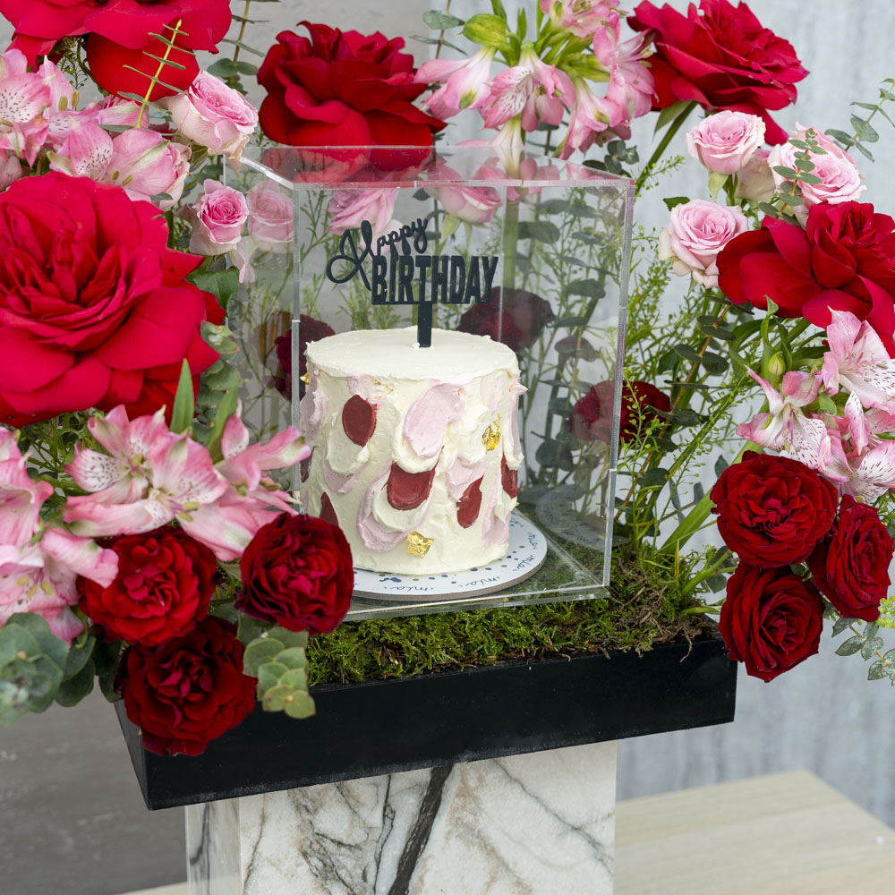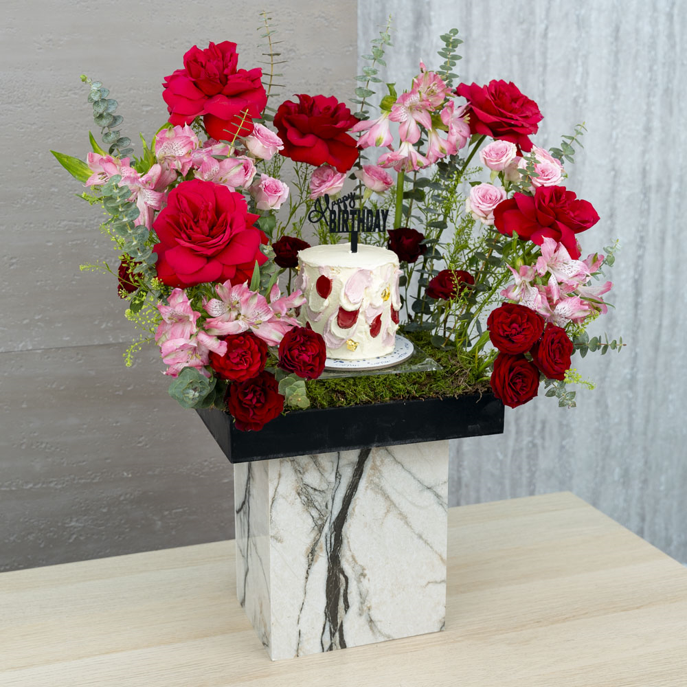 باقة تتميز بأزهار السترومريا، جوري وبيبي روز مع كيكة الشوكولاتة.