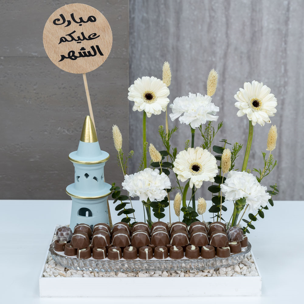 هذه الباقة تحتوي على الجوري والكارنيشن مع كيكة الشوكولاتة.