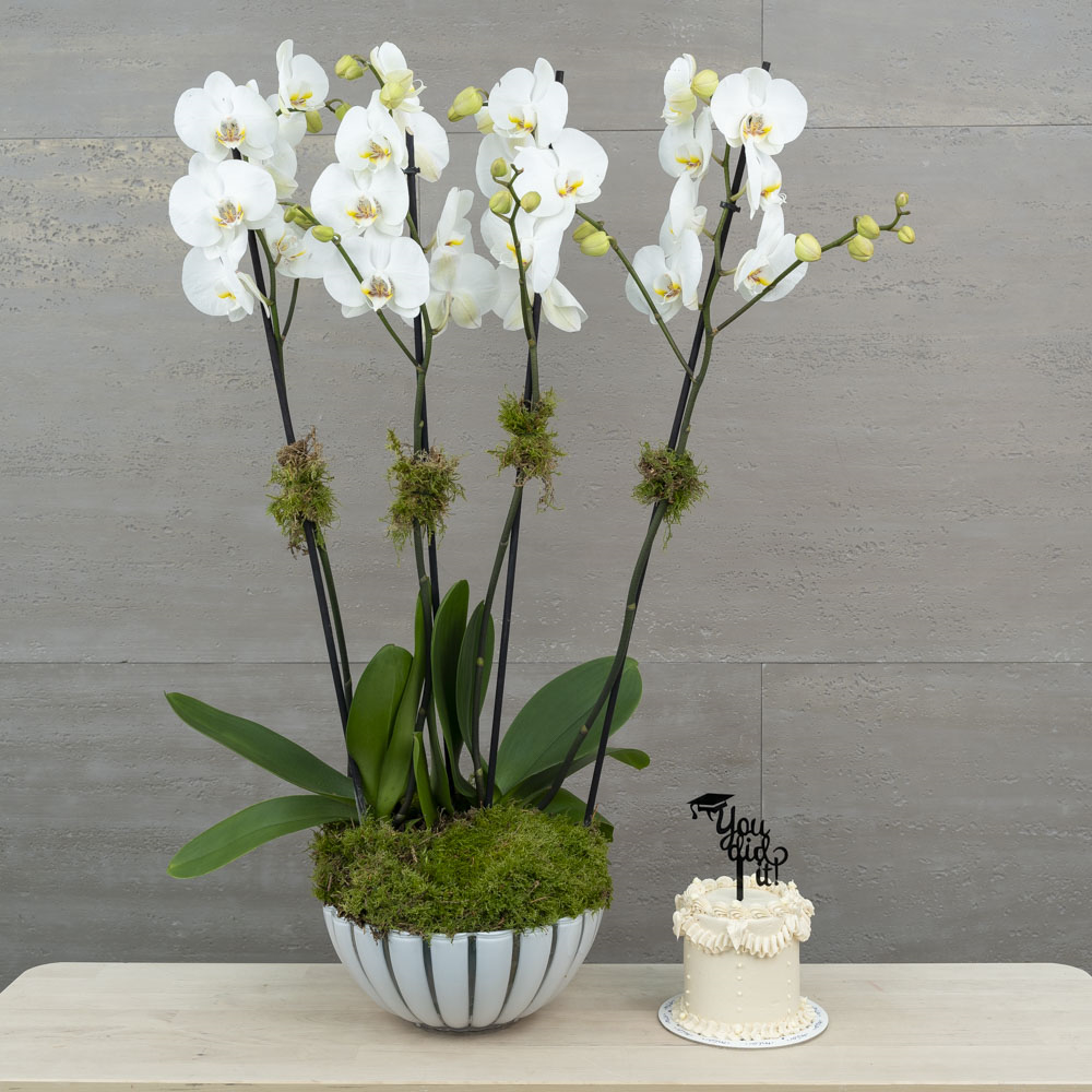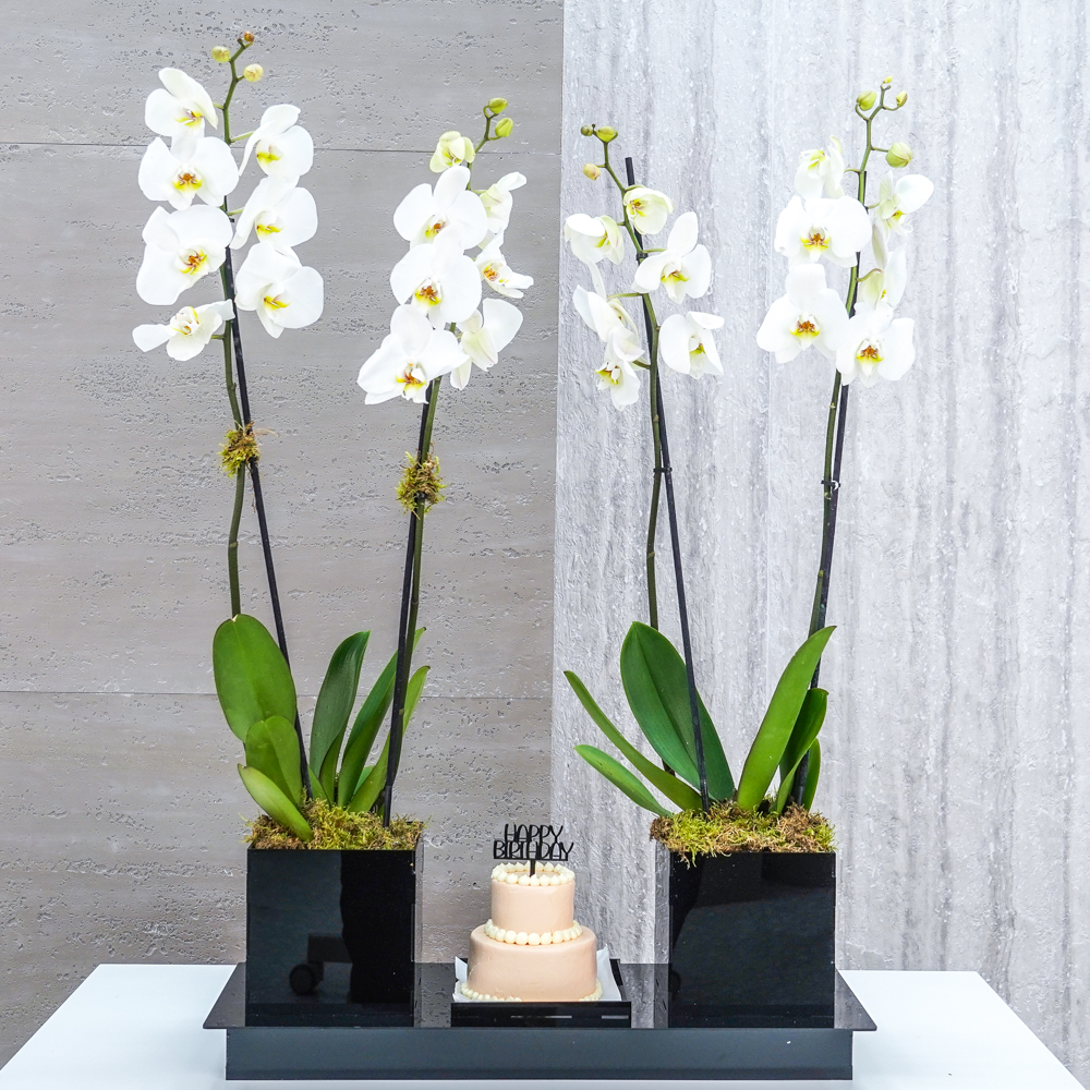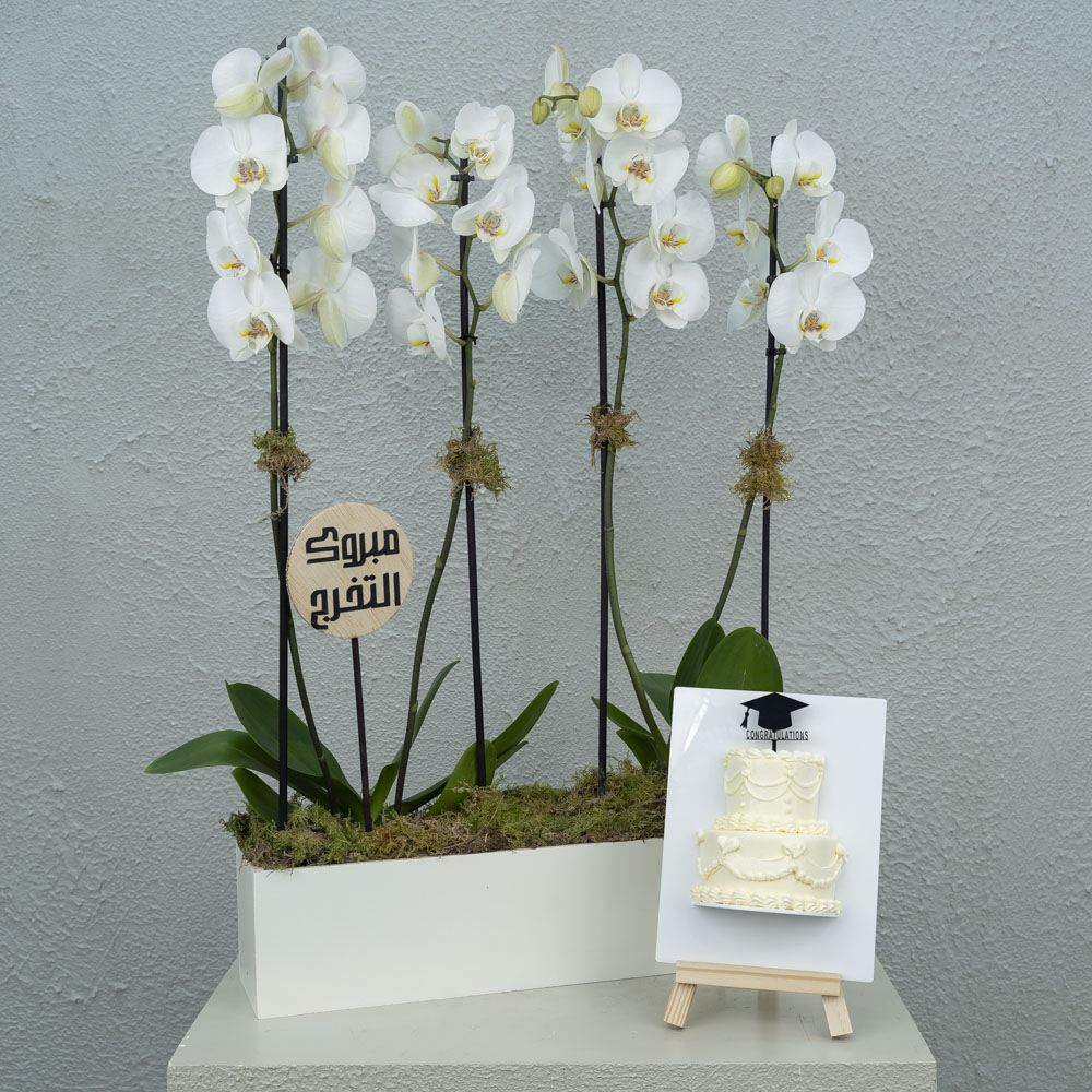 تحتوي هذه الباقة على زهور الأوركيد مع كيكة الشوكولاتة.