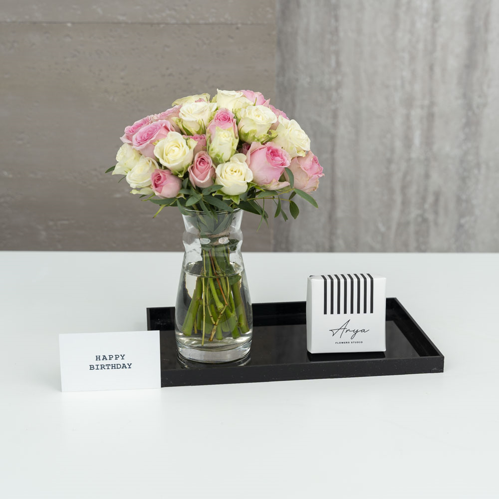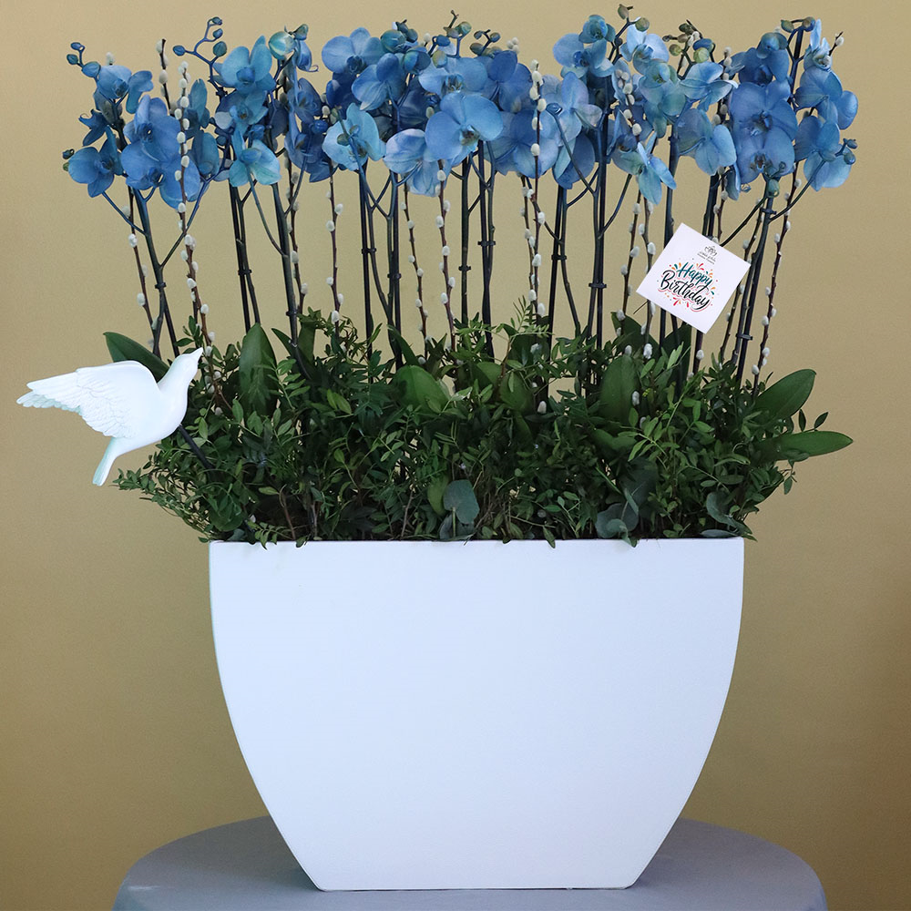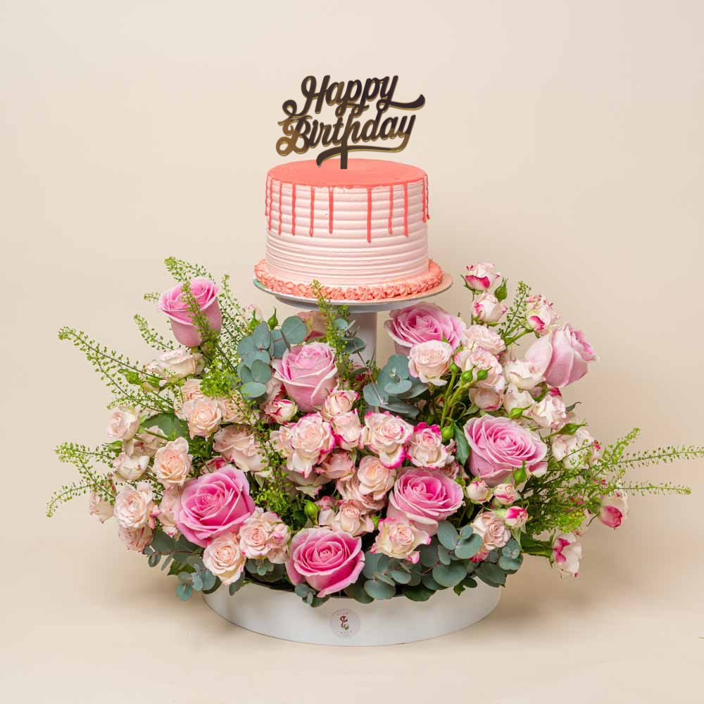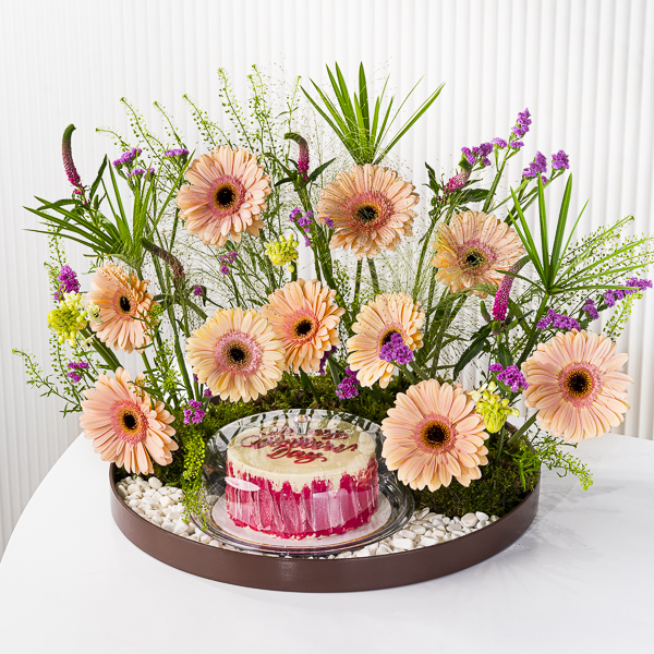 تحتوي هذه الباقة على زهور الأوركيد مع كيكة الشوكولاتة.