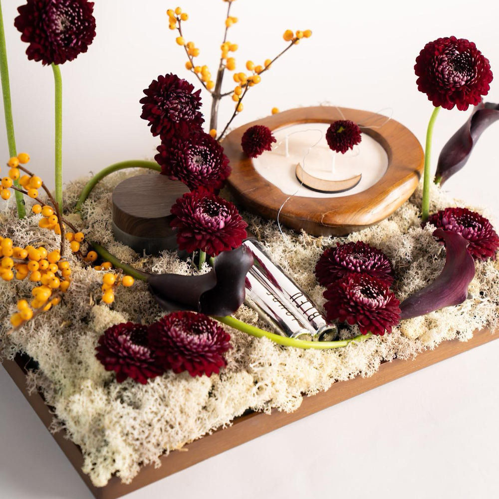 هذه الباقة تحتوي على تنسيق أنيق من زهور الجيربيرا والكالا ليلي باللون العنابي وتتضمن شمعة خشبية طبيعية، معمول 3 تولة وزجاجة عطر جون اند بلو سعتها 30 مل، ليكون هدية مثالية لشهر رمضان المبارك.