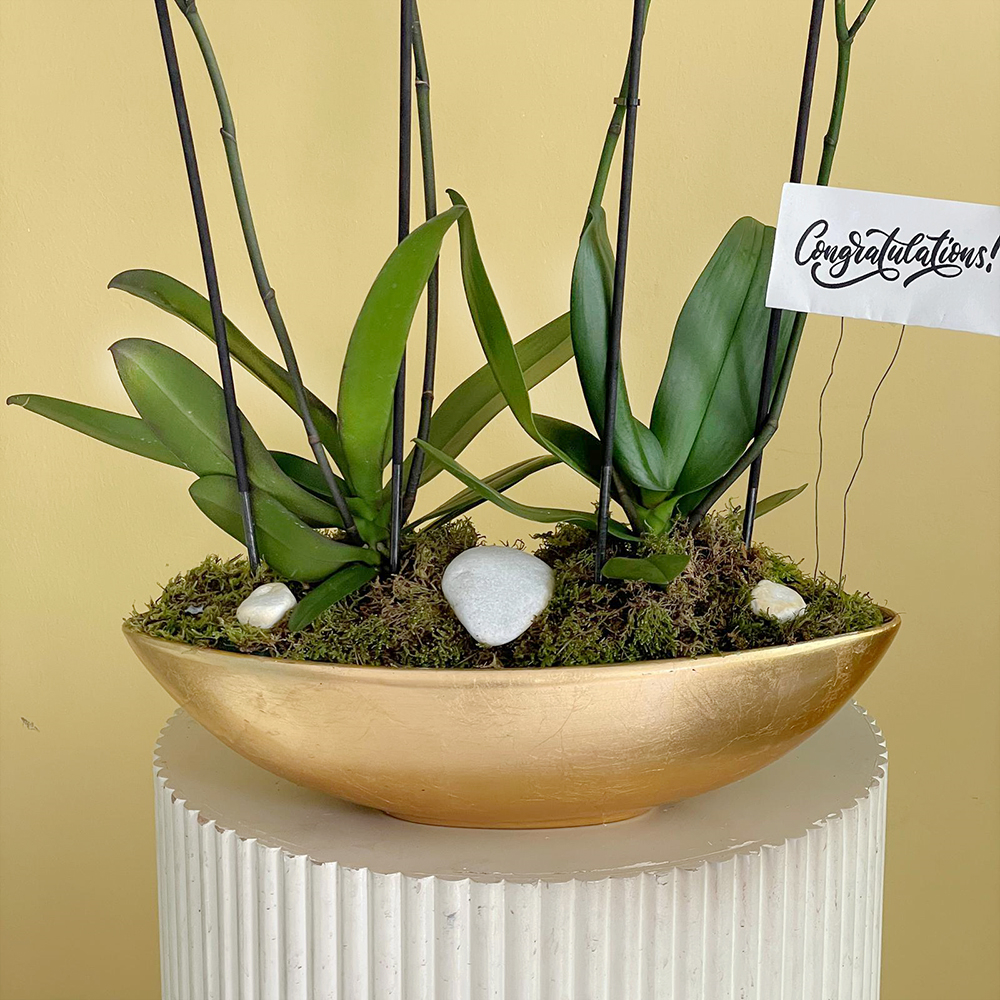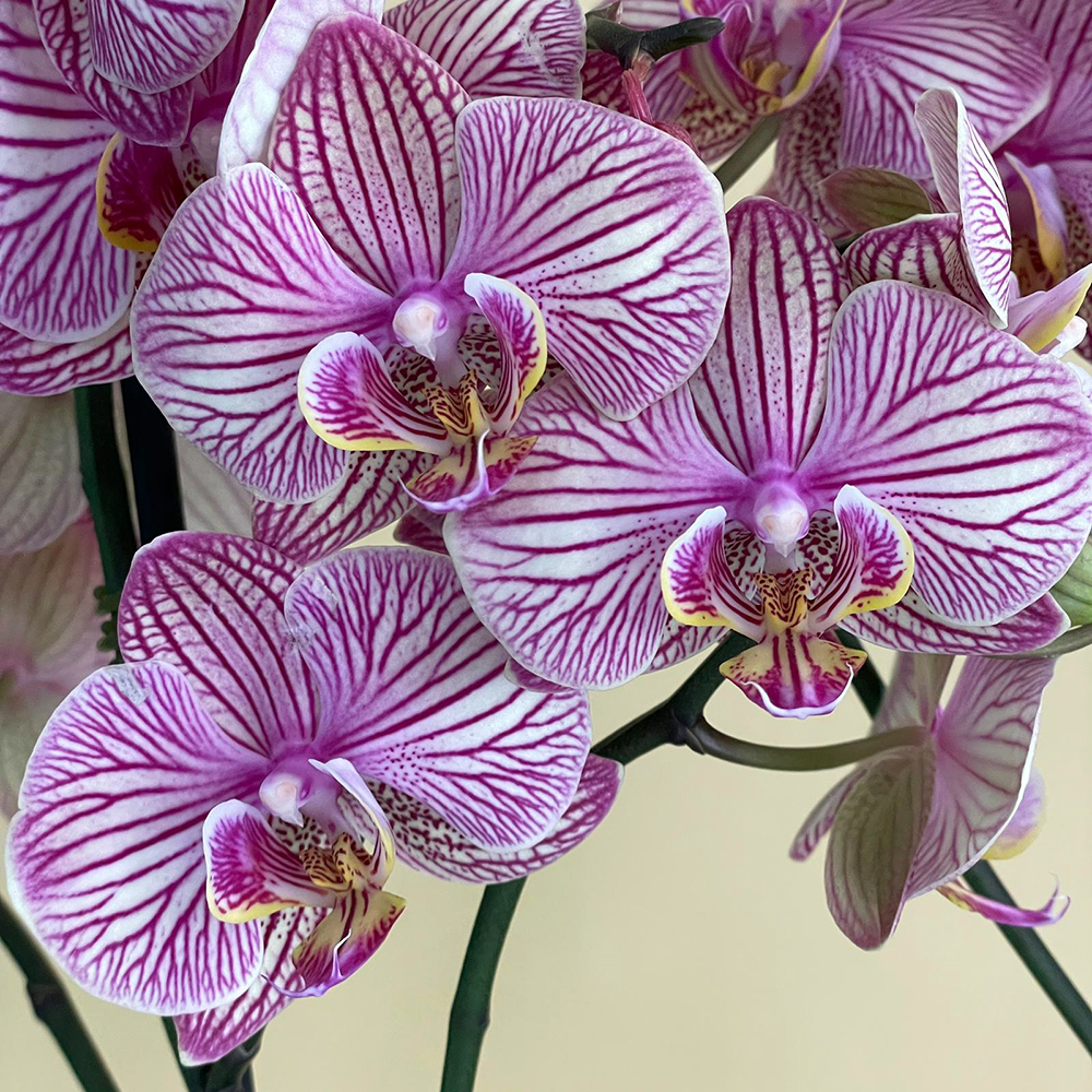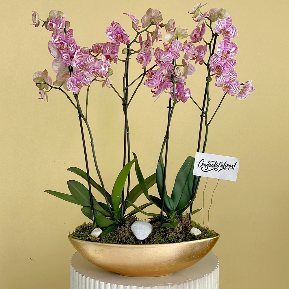 فازة تحتوي على نباتات الأوركيد المميزة.