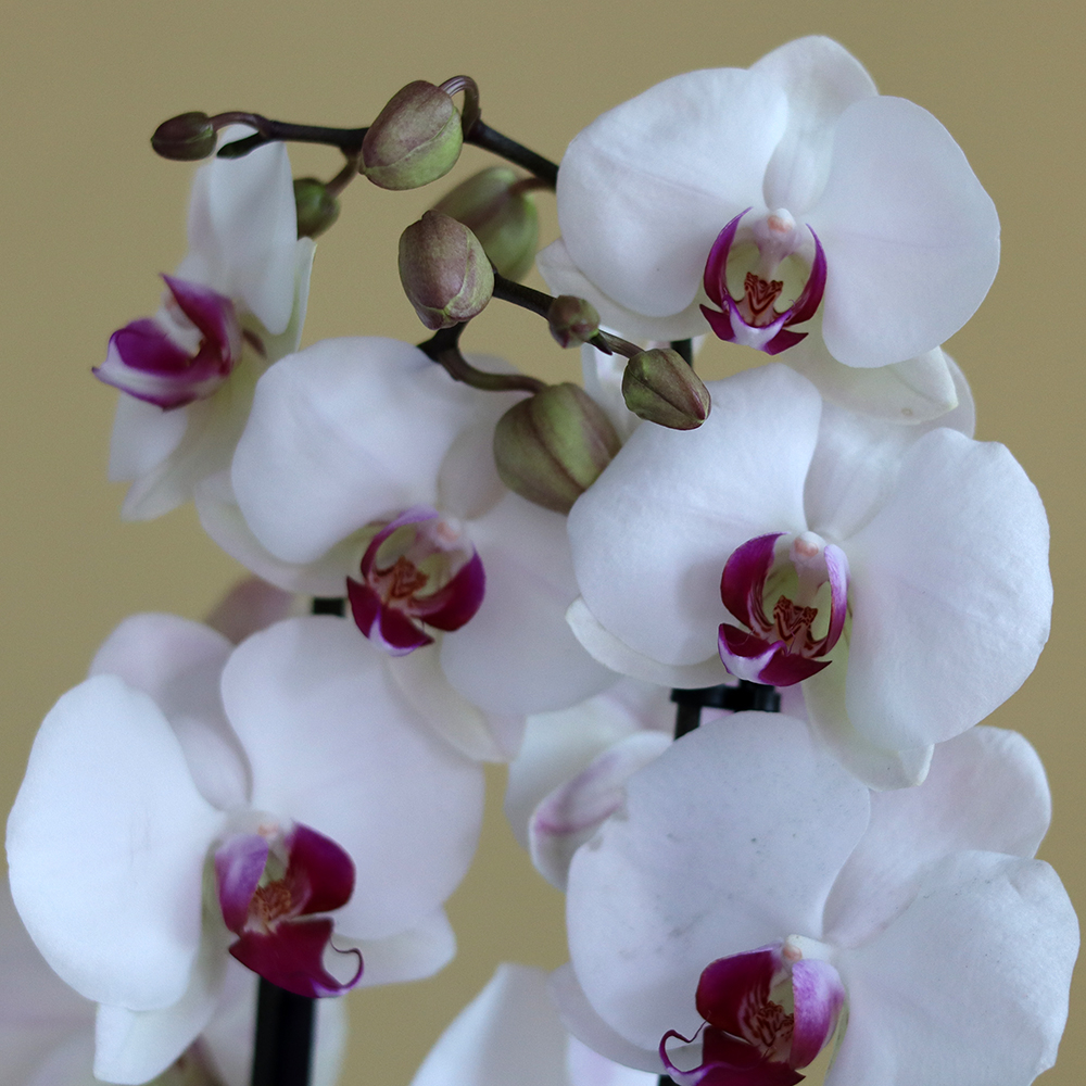 باقة تحتوي على نباتات الأوركيد البيضاء ذات الشفاه الحمراء، مرتبة بشكل جميل في فازة فاخرة.