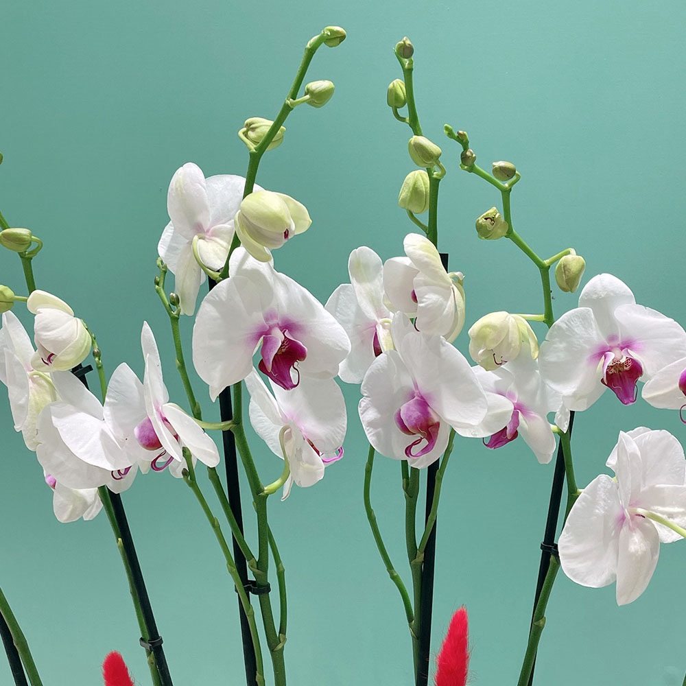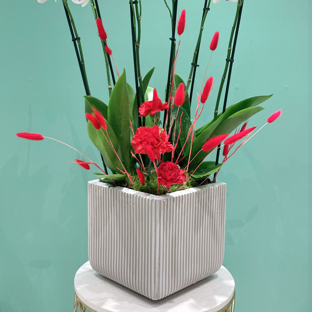 فازة تحتوي على الأوركيد ذات الشفاه الحمراء.