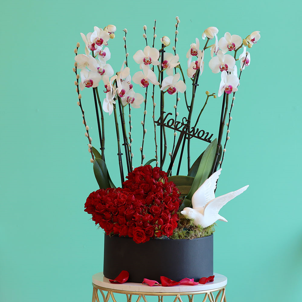 تنسيق زهور الأوركيد ذات الشفاه الحمراء مع الورود الصغيرة في فازة فاخرة.
