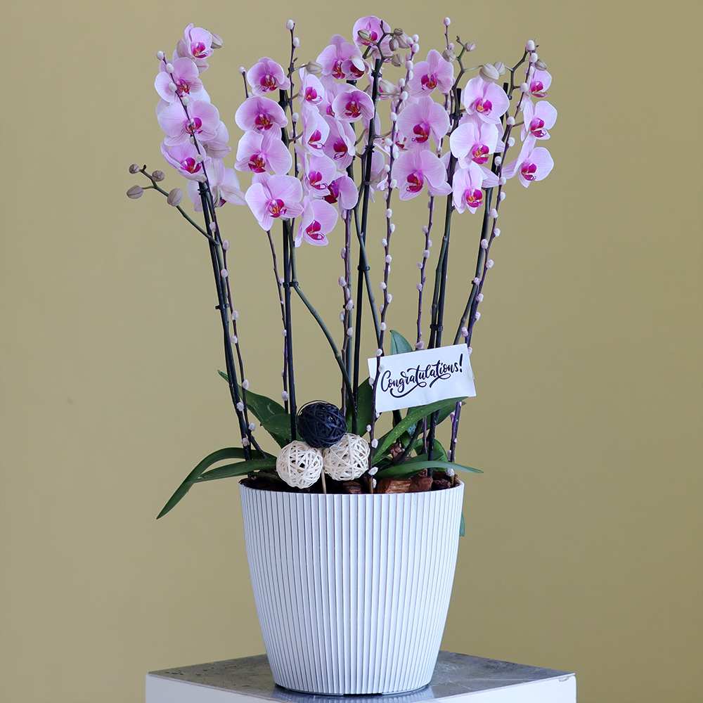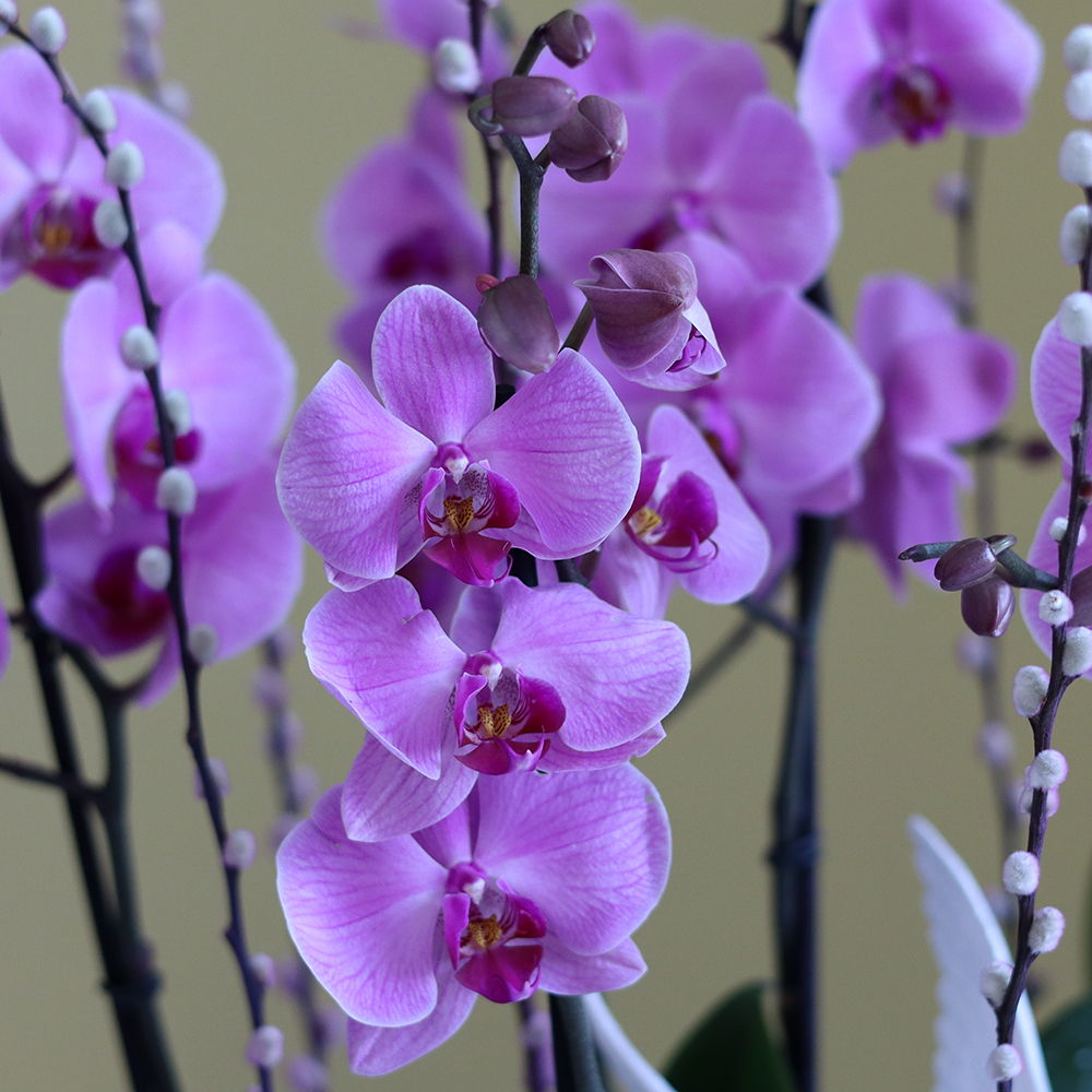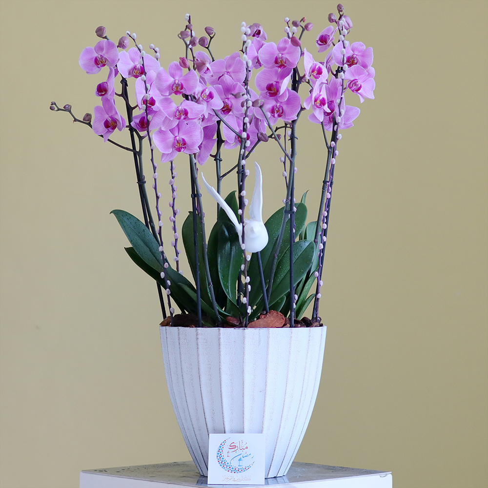 باقة تحتوي على نباتات الأوركيد الوردية، مرتبة بشكل جميل في فازة فاخرة.