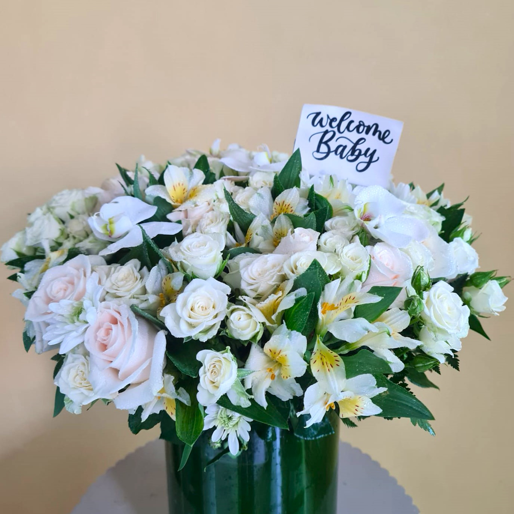 باقة بيضاء من زهور الجوري، البيبي جوري، الألستروميريا والكريز، مرتبة بشكل جميل في فازة زجاجية أسطوانية.