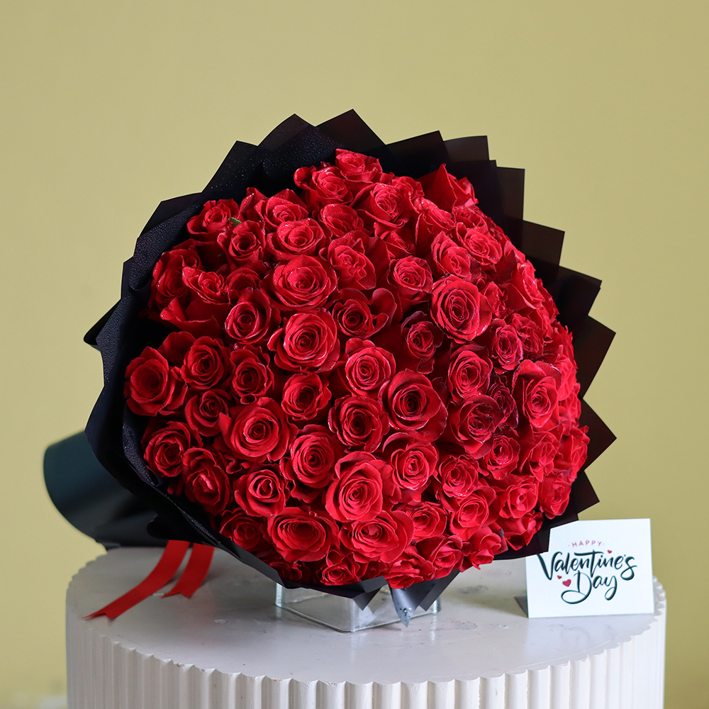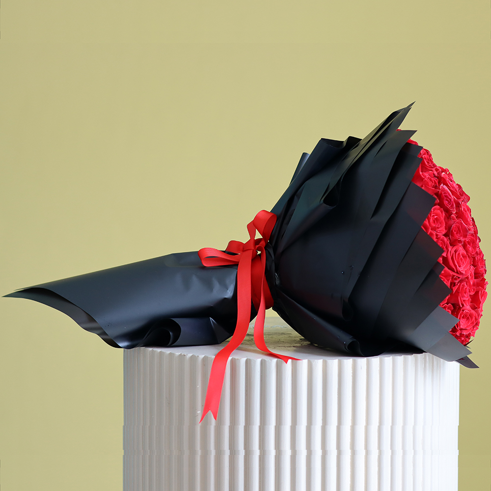 باقة فاخرة تضم مئة وردة حمراء مغلفة بغلاف خاص.