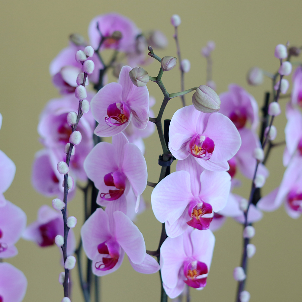 باقة تحتوي على نباتات الأوركيد الوردية، مرتبة بشكل جميل في فازة فاخرة.