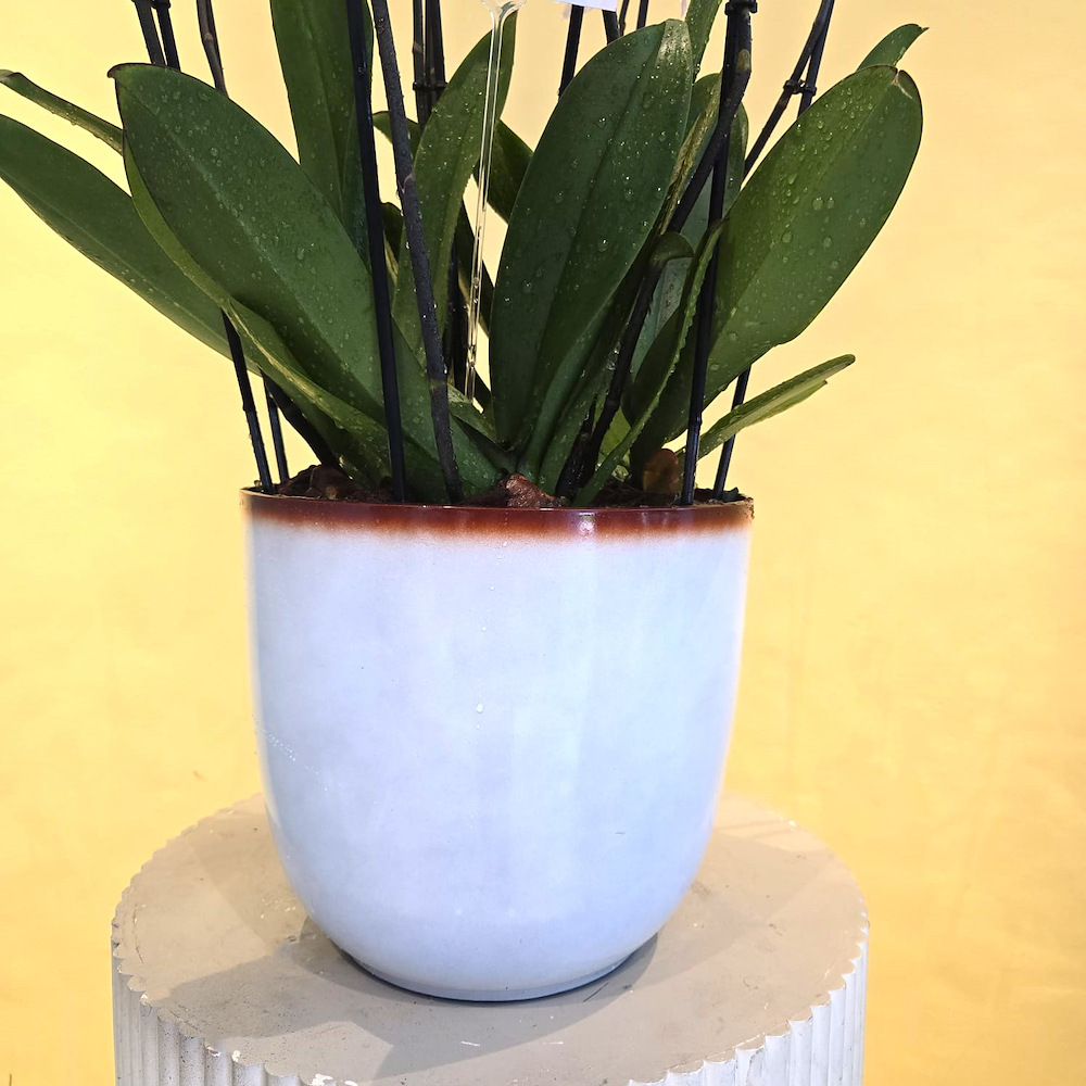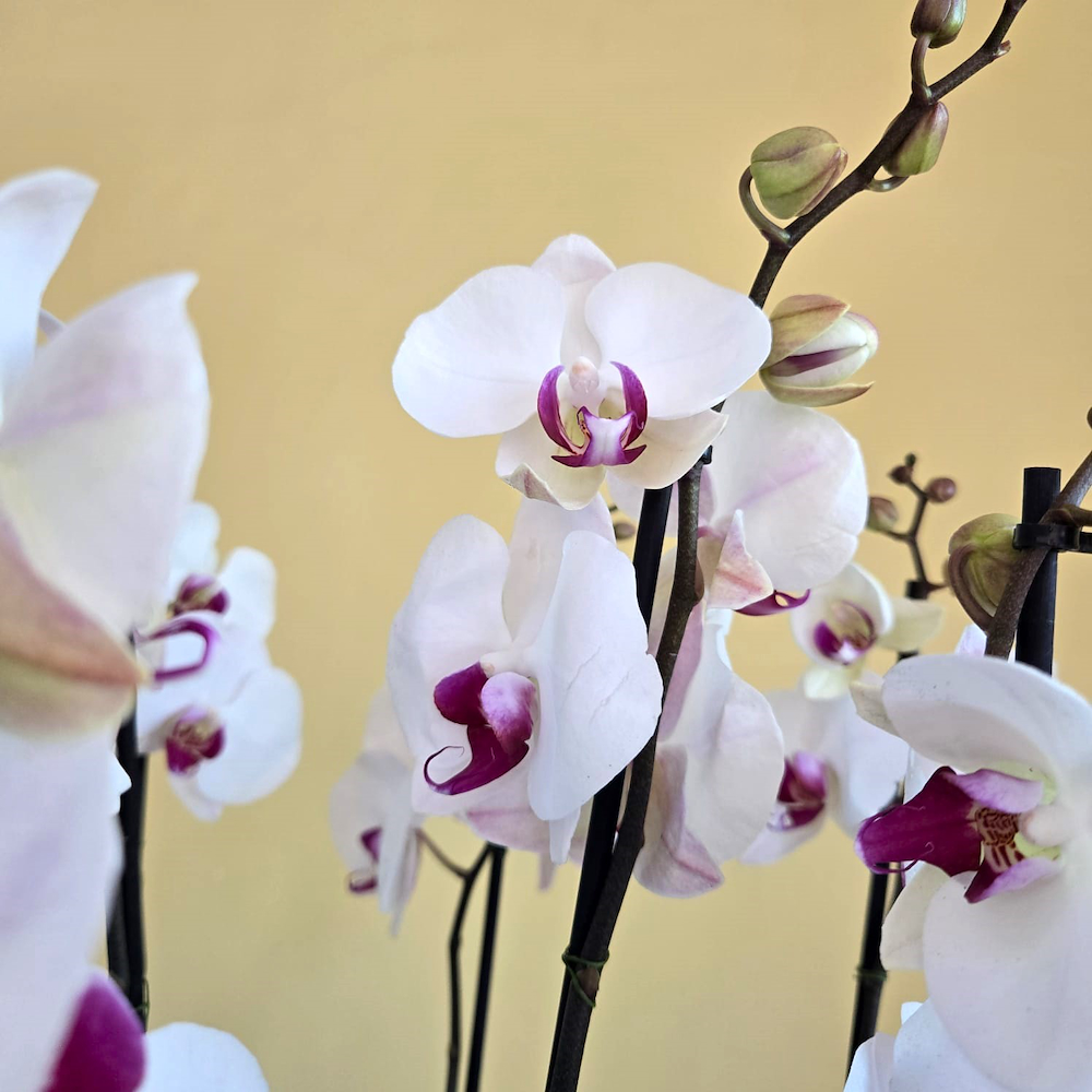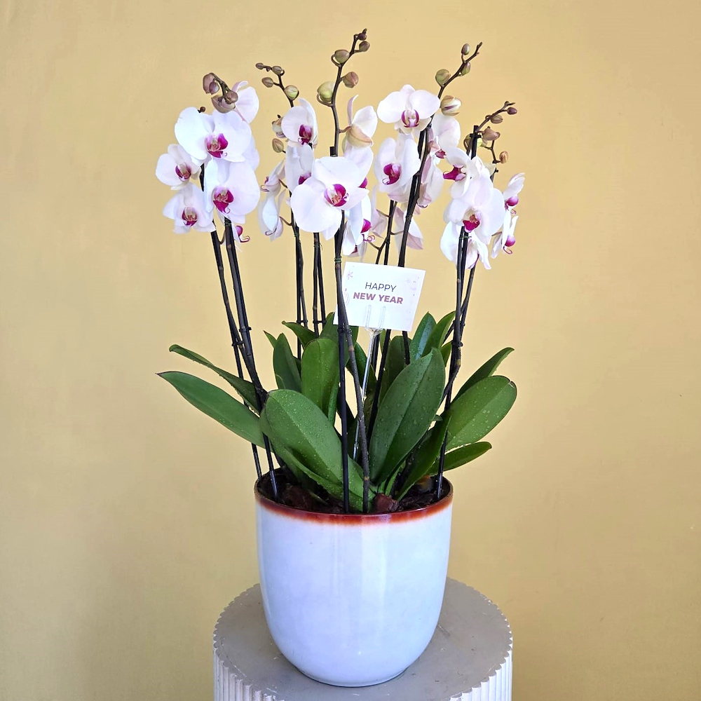 ترتيب جميل من نباتات الأوركيد ذات الشفاه الحمراء في فازة بيضاء.