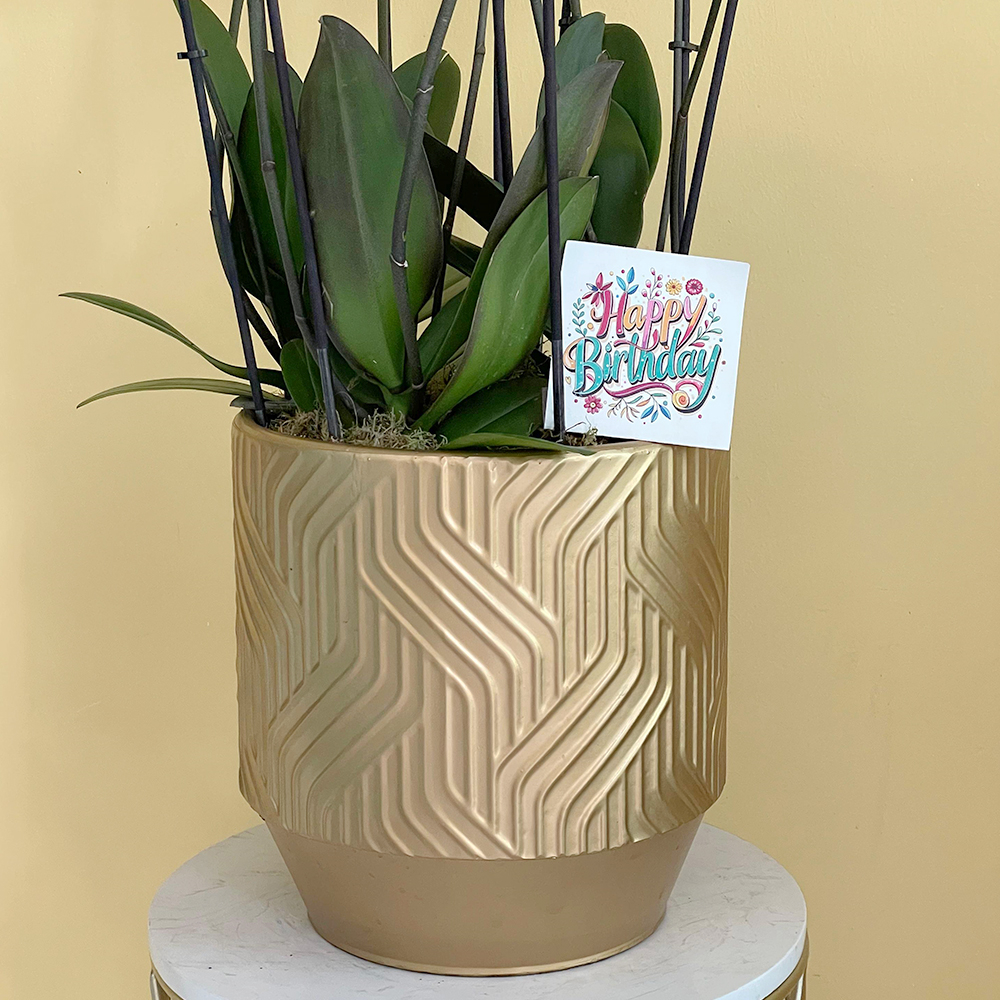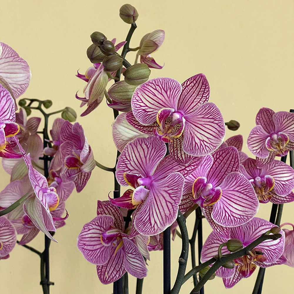 باقة تحتوي على زهور الأوركيد الوردية، مرتبة بشكل جميل في فازة فاخرة.