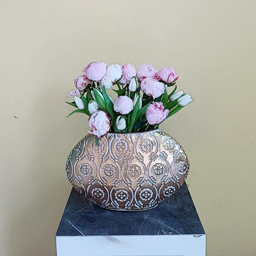 فازة فاخرة مليئة بنباتات الأوركيد باللون الوردي وأزهار السترومريا.