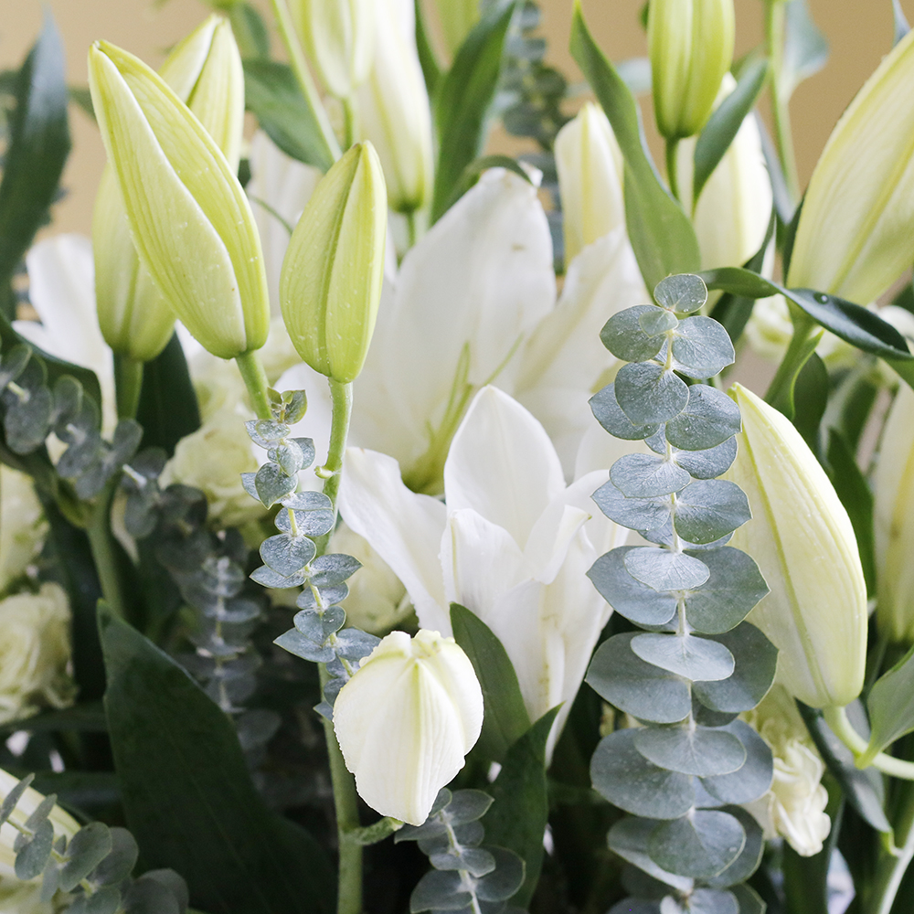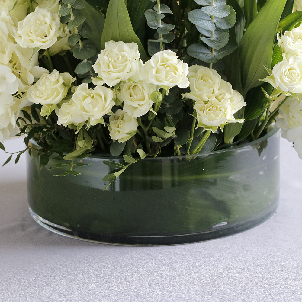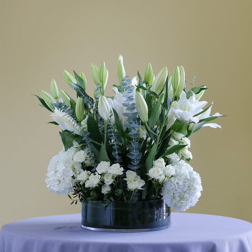 فازة شفافة أنيقة مليئة بأزهار الليليز، الكوبية والبيبي روز باللون الأبيض.