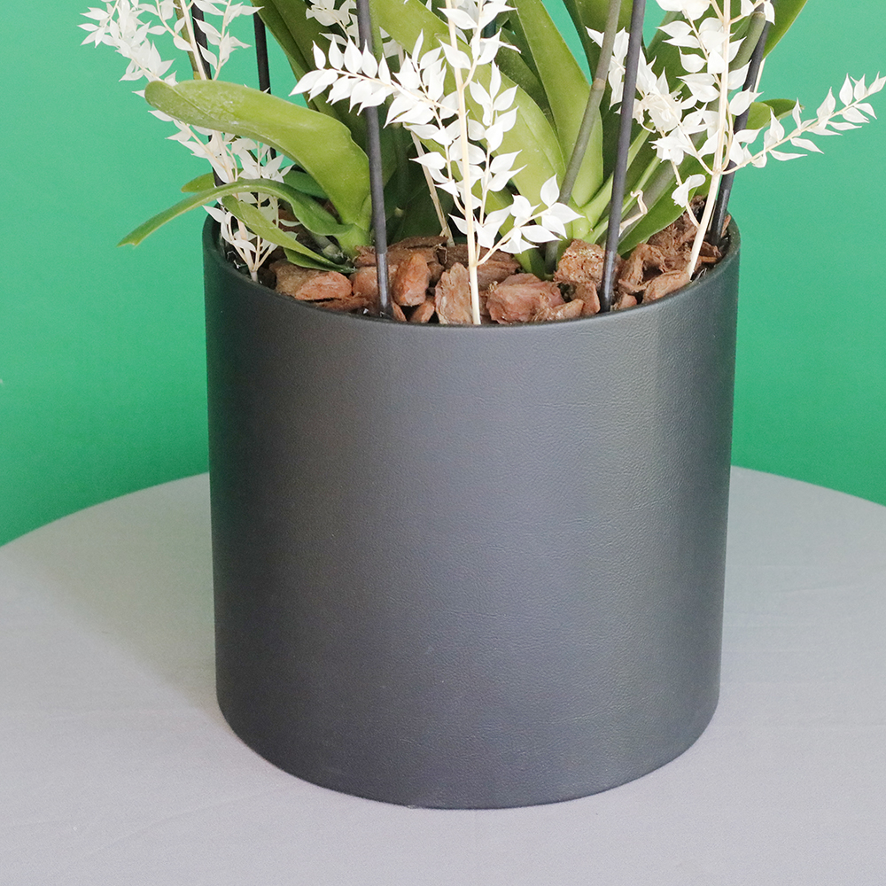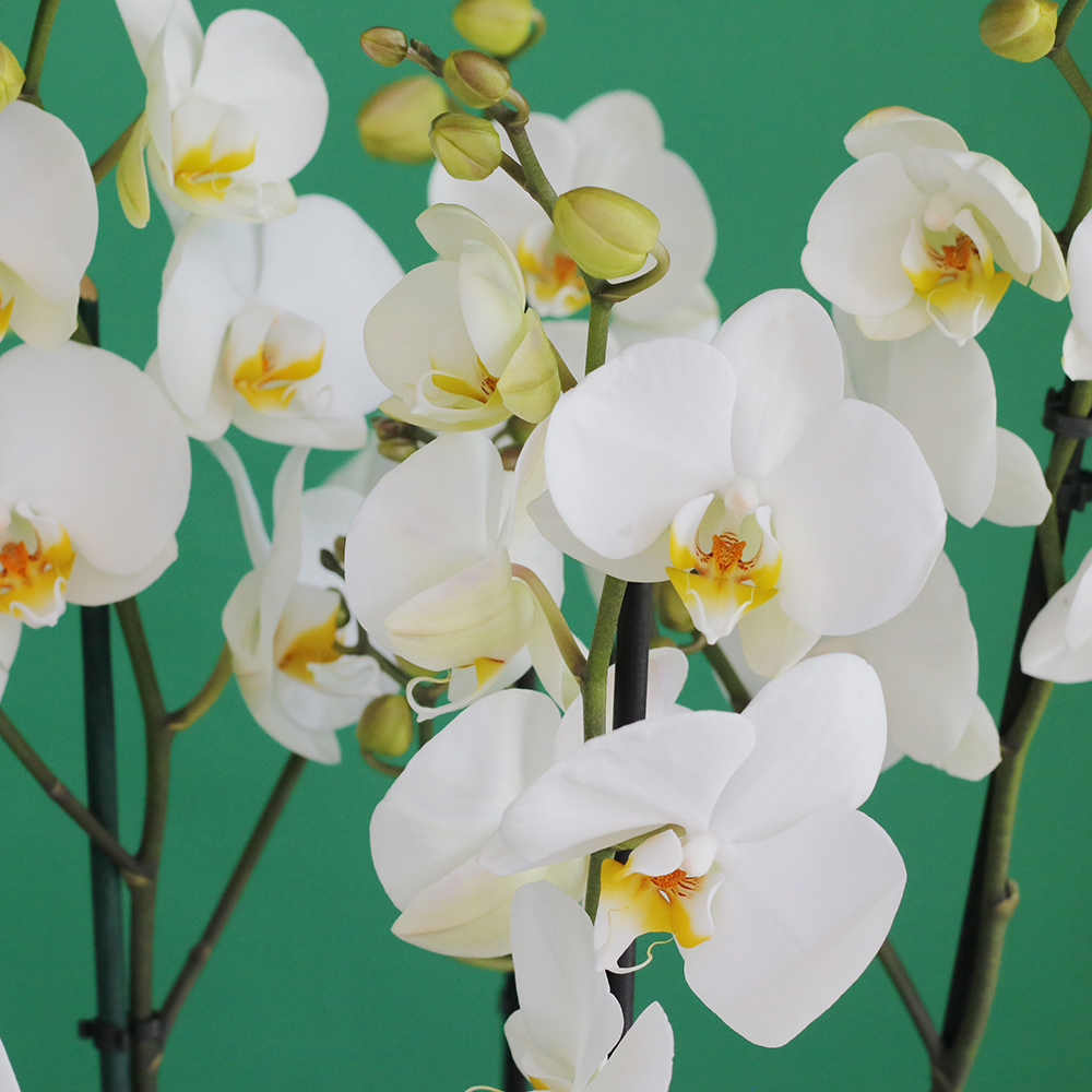 باقة تحتوي على نباتات الأوركيد (الفالانوبسيس) البيضاء، مرتبة بشكل جميل في فازة فاخرة.