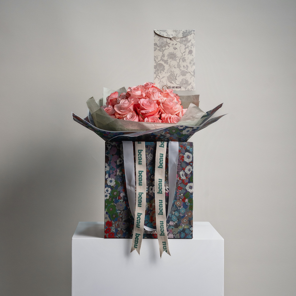 باقة فاخرة مليئة بأزهار الجوري باللون الوردي.