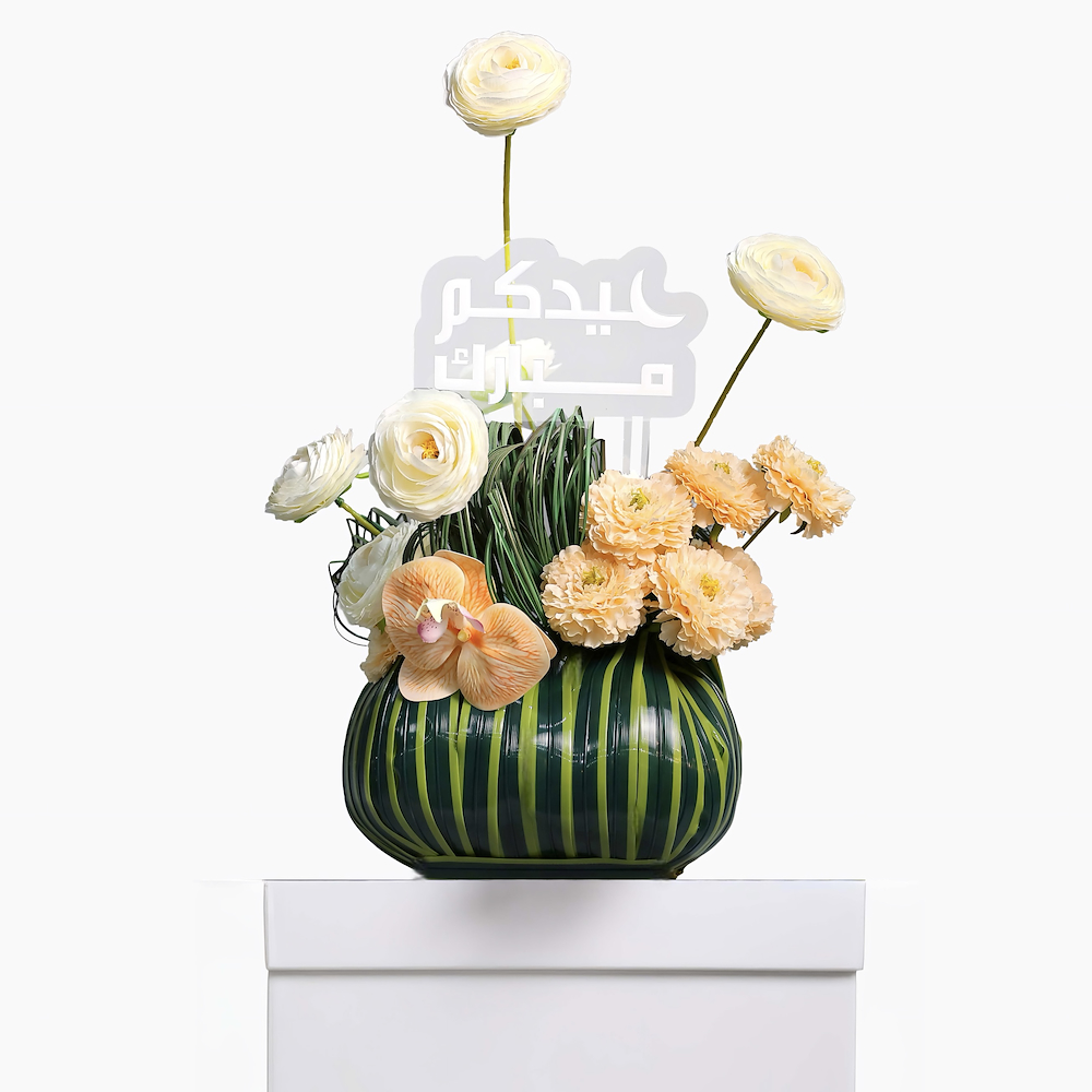تنسيق فاخر من الزهور الصناعية يحتوي على زهور الرانونكولس والأوركيد داخل تنسيق مخطط أنيق مع تغريسة “عيدكم مبارك".
