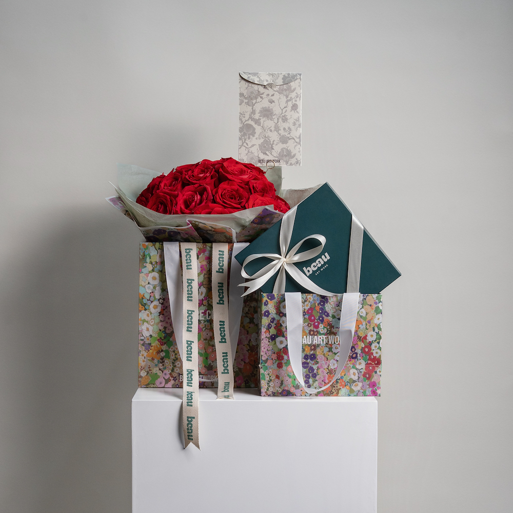 25 زهرة جوري حمراء بتنسيق فاخر داخل صندوق أنيق. تأتي مع علبة شوكولاتة من الشيف منيرة الهبيش (بيمونت).
