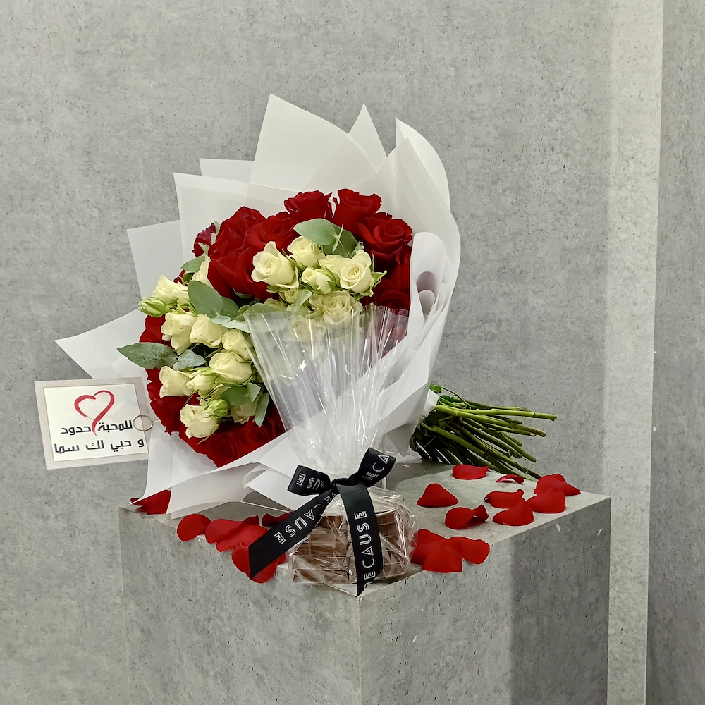 تحتوي باقة اليد على زهور الجوري والبيبي جوري وتأتي مع شوكولاتة في تنسيق جميل.