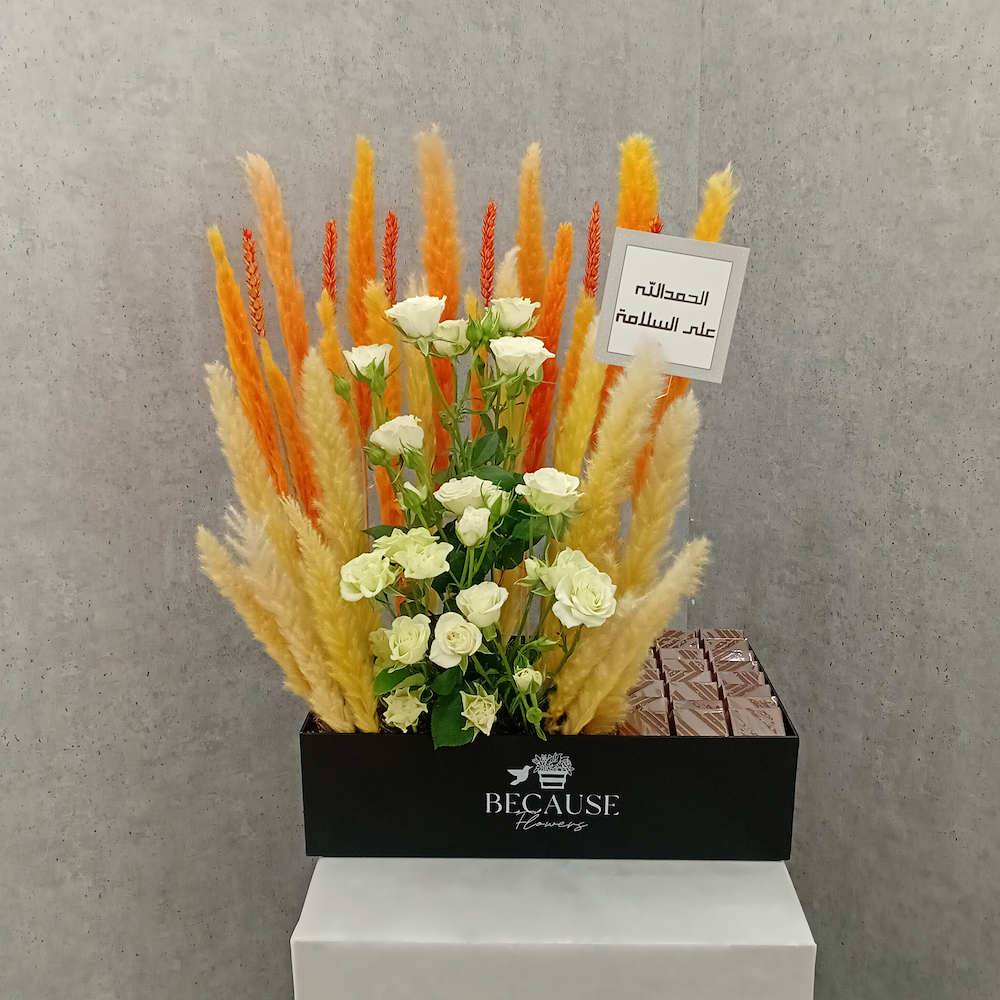 باقة تحتوي على بيبي جوري ونبات البامباس مع الشوكولاتة.