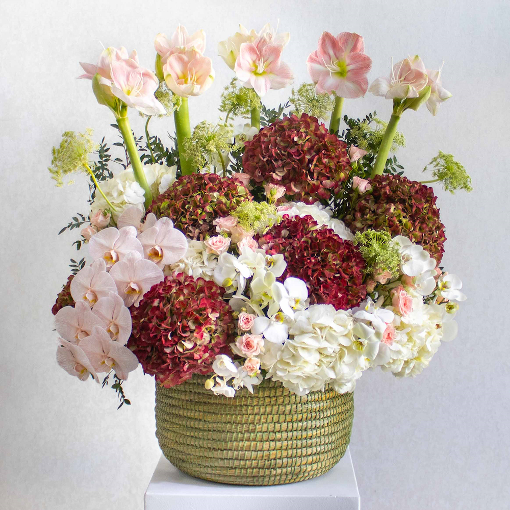 هذه الفازة من الجلد تحتوي على زهور الهيدرينجا البيضاء.