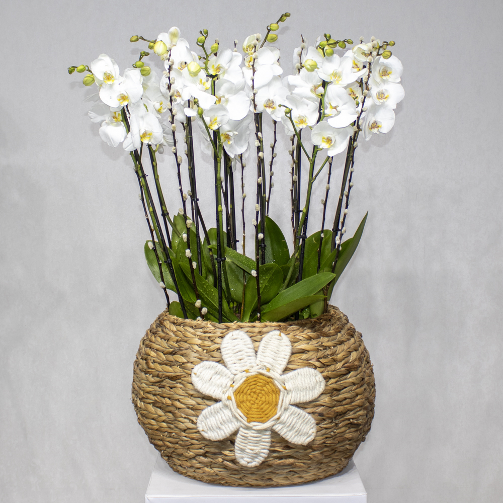 تحتوي هذه المزهرية البيضاوية على نباتات الأوركيد البيضاء.