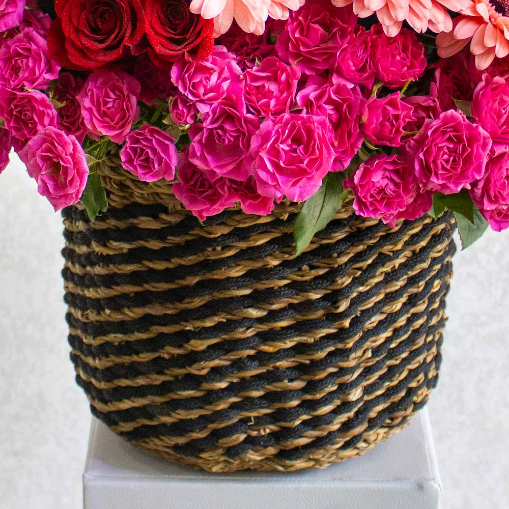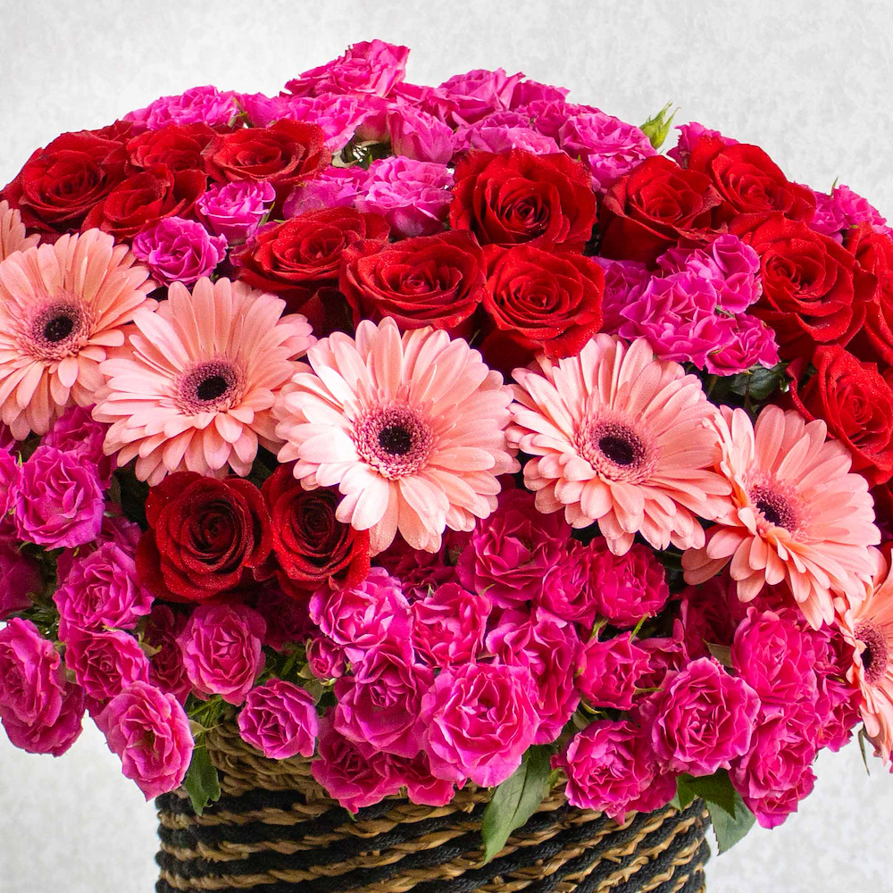 مزهرية مليئة بأزهار الجربيرا والجوري والجوري الصغيرة.