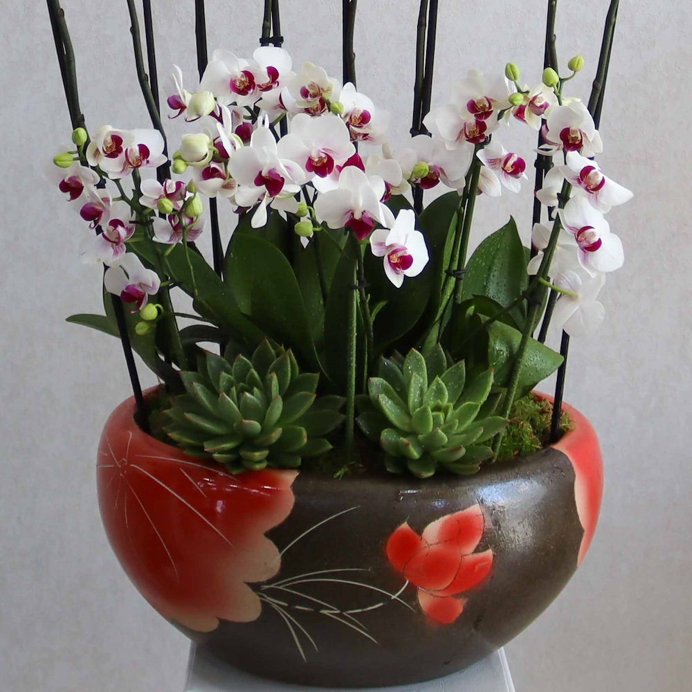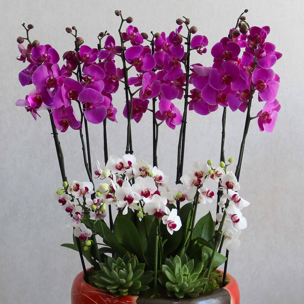 تحتوي هذه الباقة على نباتات الأوركيد باللون الأرجواني والأبيض، مرتبة بشكل جميل في فازة من السيراميك.