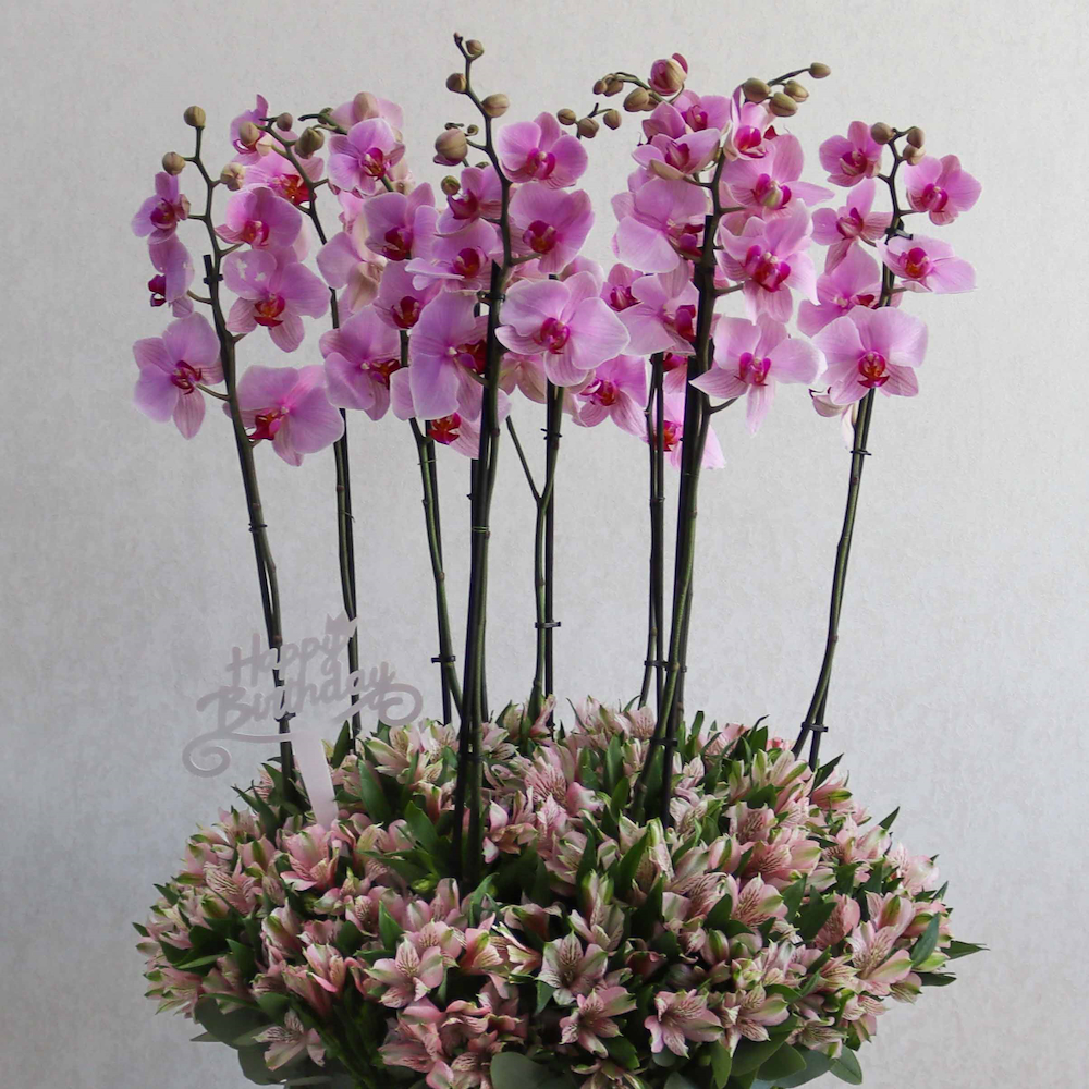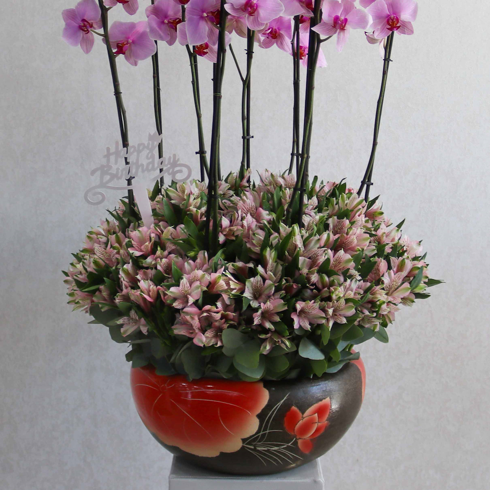 تحتوي هذه الباقة على زهور الألستروميريا باللون الوردي ونباتات الأوركيد الوردية، مرتبة بشكل جميل في فازة من السيراميك.