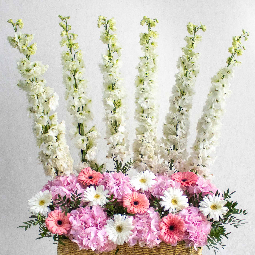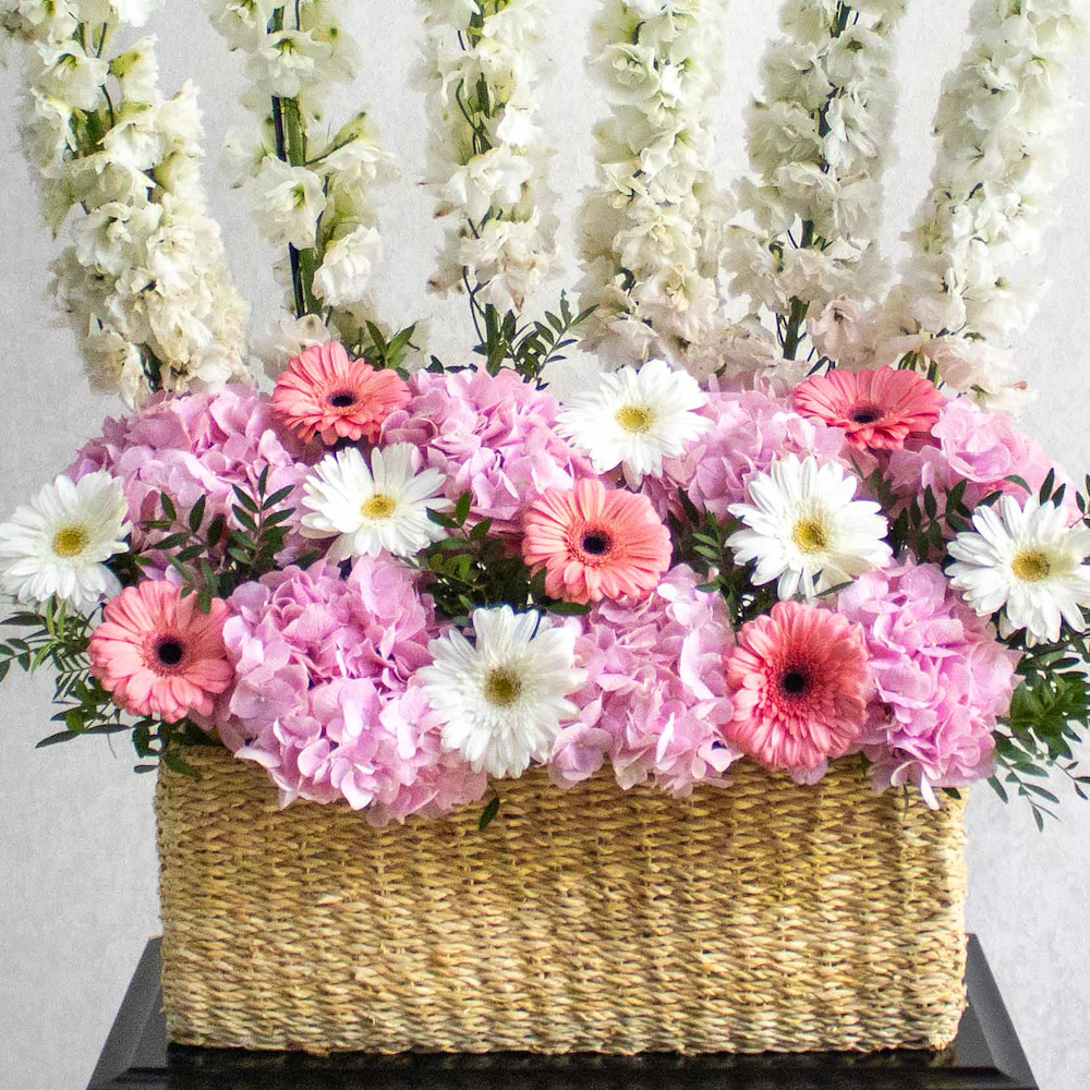 تنسيق زهور كبير في سلة مستطيلة، يضم زهور الهايدرينجا، الجيربيرا والدلفينيوم.